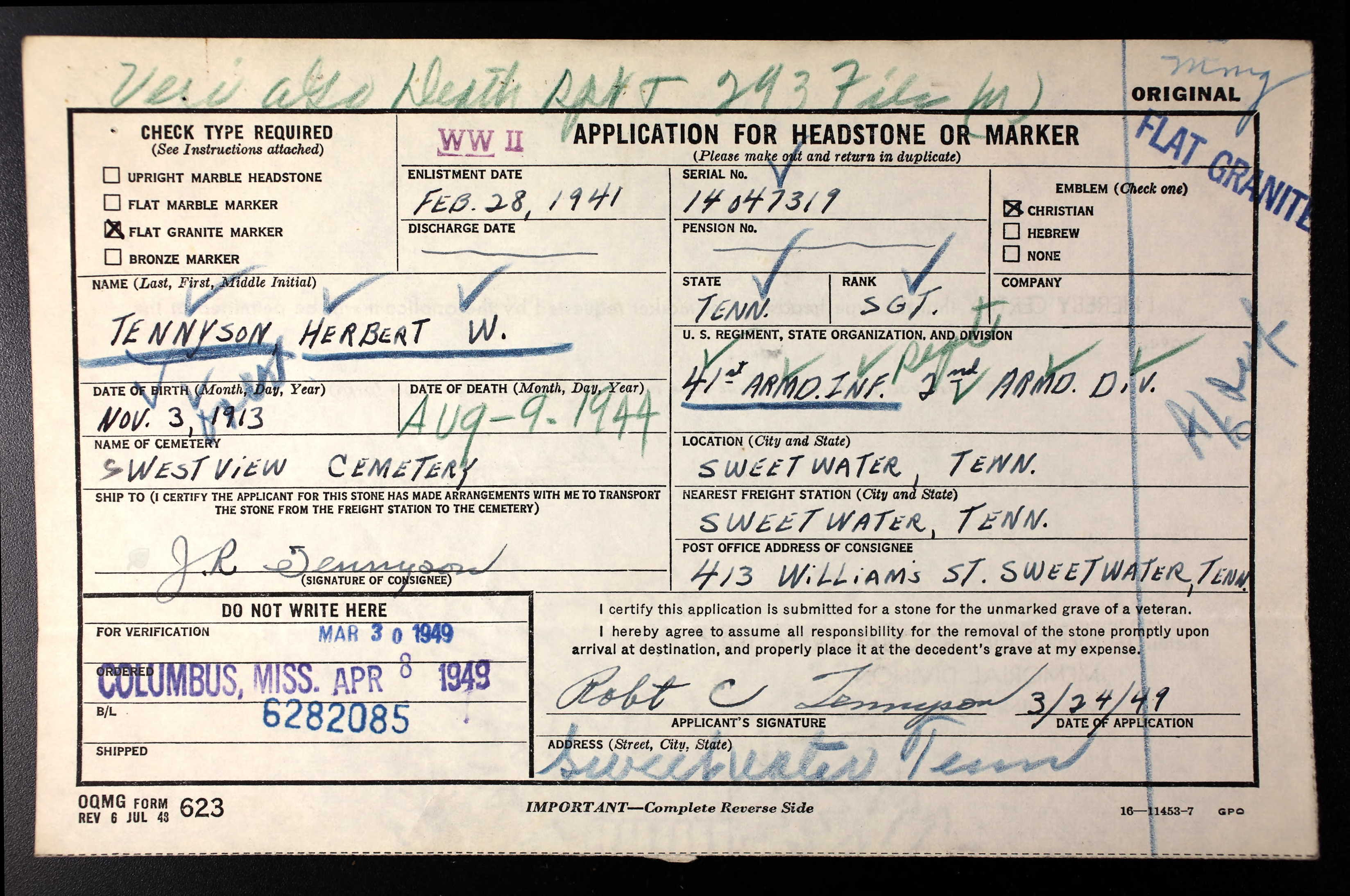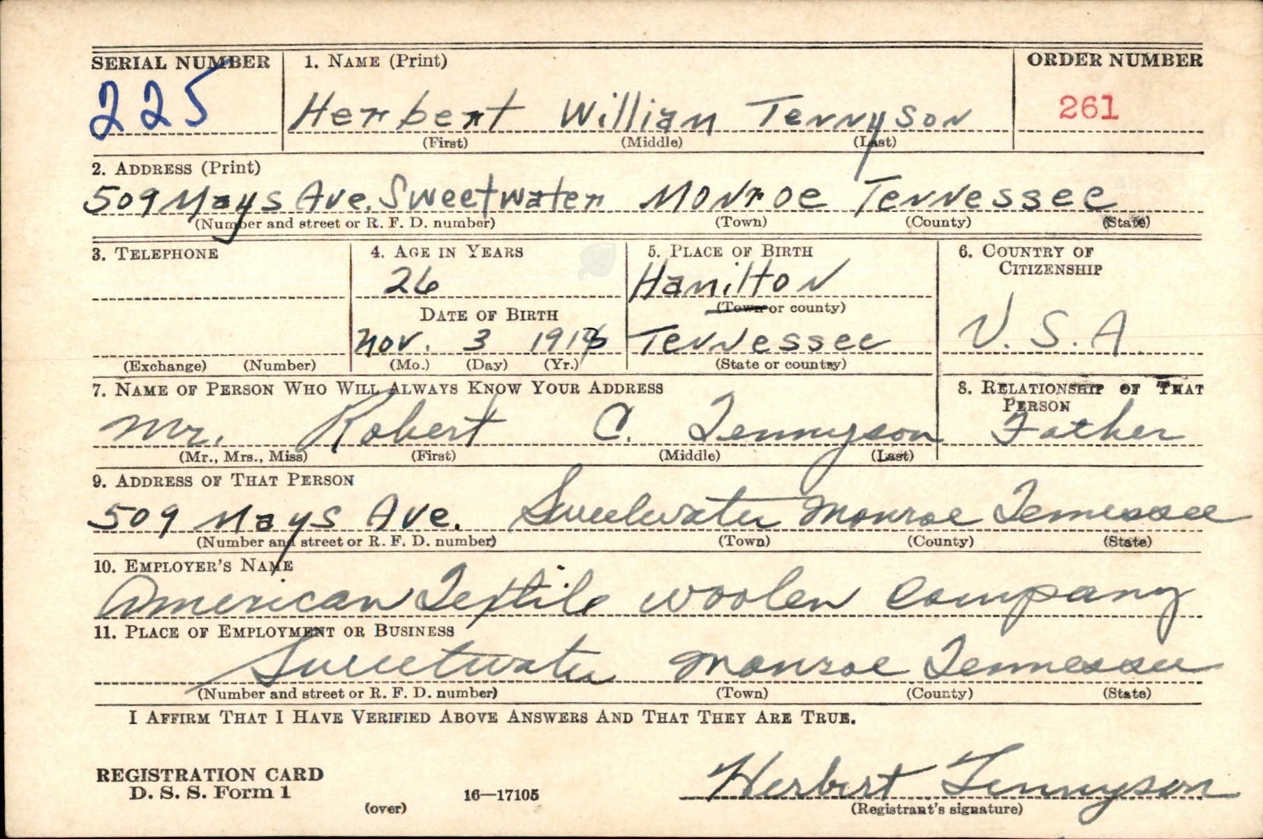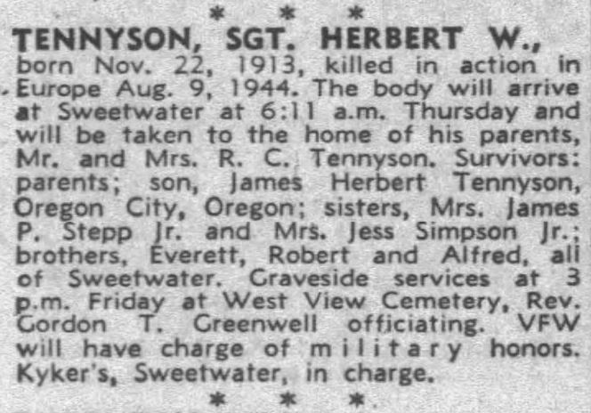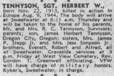 Herbert William Tennyson was born 3 November 1913, the son of Robert Cleveland Tennyson and Edith Flora Ghann Tennyson. He married Iva Beatrice Morris in 1941. They were the parents of James Herbert Tennyson.