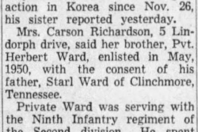 Private First Class Ward was member of Company G, 2nd Battalion, 9th Infantry Regiment, 2nd Infantry Division. He was listed as Missing in Action while fighting the enemy in North Korea. He was presumed dead on December 31, 1953. His remains were not recovered. His name is inscribed on the Courts of the Missing at the Honolulu Memorial.