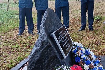 For several days, the weather had been fine – but not on Saturday! It was appalling, with gale-force wind and driving rain; the combination of gloom and noise from the trees was awesome. It could have been a scene from “Tam 0′ Shanter”, by Robert Burns. Despite these adverse conditions, the Aircrew Association, Air Training Corps, RAF Association and Royal British Legion Scotland all were represented. A US Air Force officer, on exchange posting to RAF Leuchars; Mr Douglas Alexander, the local MP; and Mr and Mrs Bill Kerr were also present. No 396 (Paisley) Squadron, ATC, provided two pipers who coped extremely well to make themselves heard above the din. The cause of the accident is believed to have been loss of the propeller – which would have had a profound effect on the balance and controllability of the aircraft. The Thunderbolt in the RAF Museum, Hendon, London, has a propeller of 13 feet diameter; a massive piece of machinery! (see https://www.aircrew-saltire.org/lib224.html)