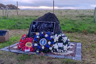 Sadly, during WW2, flying accidents in Britain were numerous and widespread, causing casualties, often fatal, to many nationalities. The idea of commemorating this particular accident originated from Bill Kerr, from Paisley, who had been an RAF fireman, then spent a further 21 years as a fireman at Glasgow Airport. While flying r/c models near Hartfield Farm, he wondered why some trees were missing from either side of the access road, then started a lengthy investigation. Thank you for your efforts Bill! Just before he left the site on 29 November 2003, he was told by a man, whose father, a farmer, had been an eye-witness of an air-crash that the aircraft’s propeller had landed in a nearby marsh. Probably it is still there!