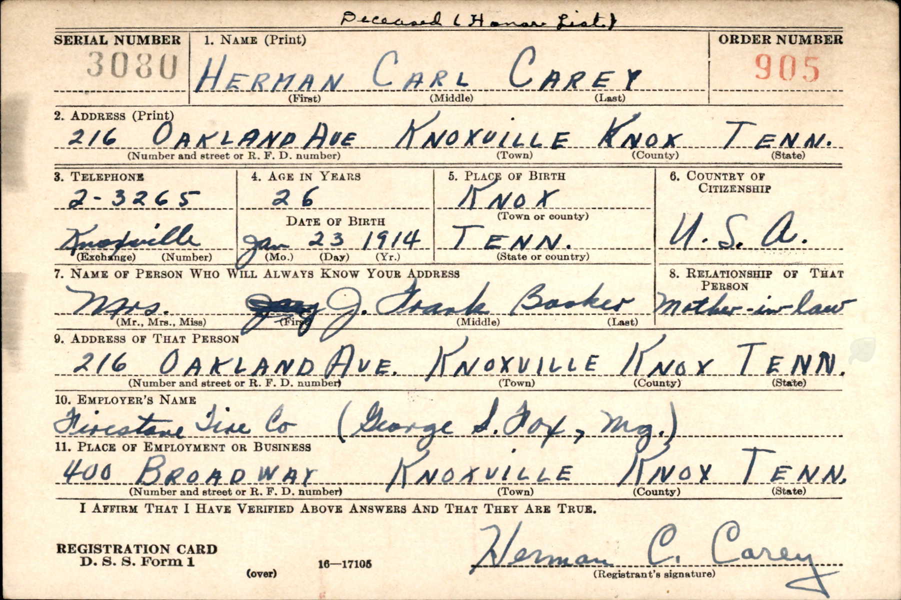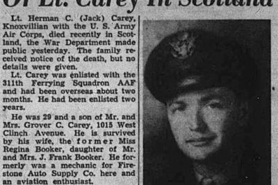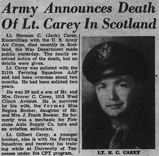 Before entering the service, Second Lieutenant Carey was employed by the Firestone Tire Company in Knoxville. His manager was George S. Fox.