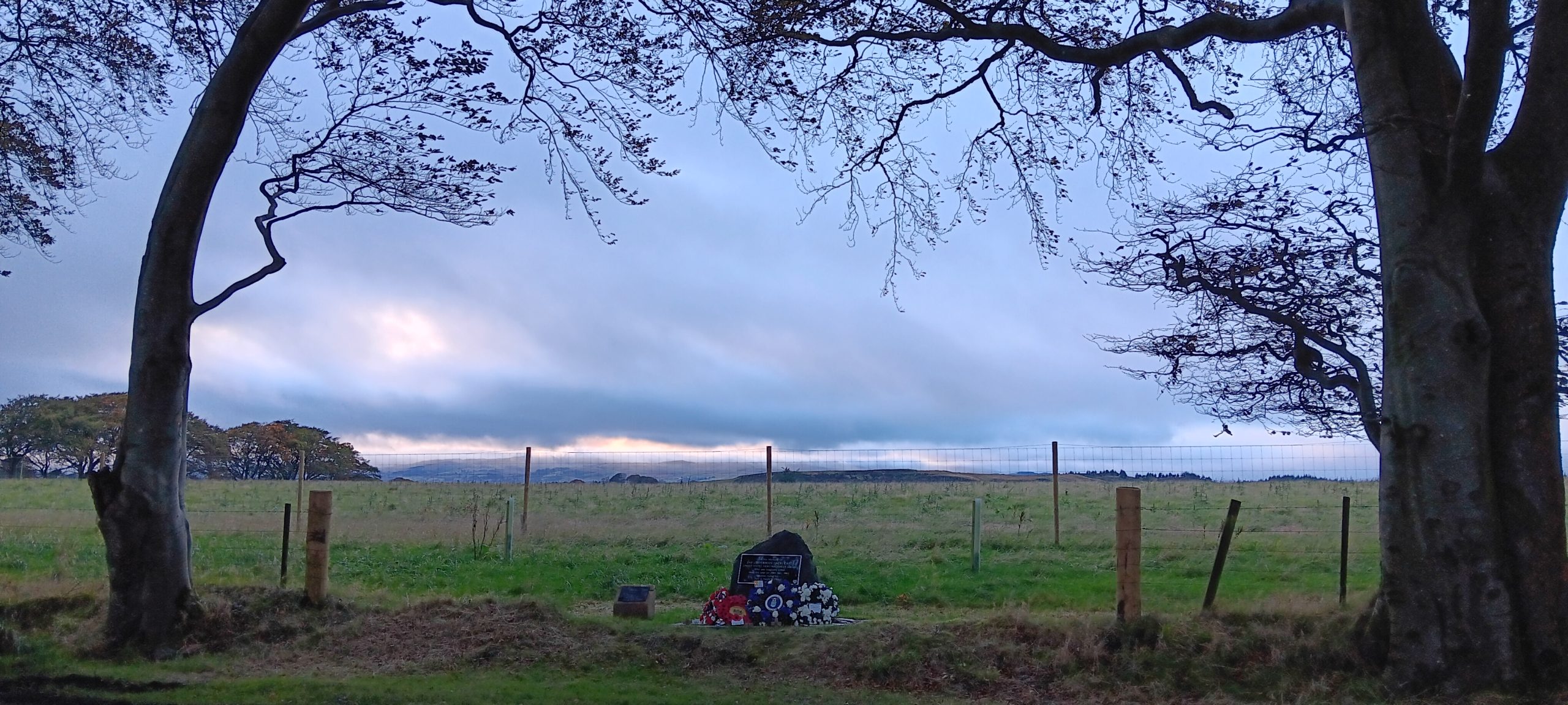 Sadly, during WW2, flying accidents in Britain were numerous and widespread, causing casualties, often fatal, to many nationalities. The idea of commemorating this particular accident originated from Bill Kerr, from Paisley, who had been an RAF fireman, then spent a further 21 years as a fireman at Glasgow Airport. While flying r/c models near Hartfield Farm, he wondered why some trees were missing from either side of the access road, then started a lengthy investigation. Thank you for your efforts Bill! Just before he left the site on 29 November 2003, he was told by a man, whose father, a farmer, had been an eye-witness of an air-crash that the aircraft’s propeller had landed in a nearby marsh. Probably it is still there!