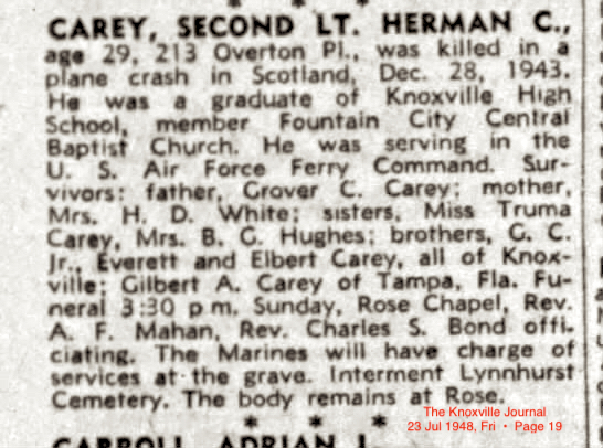 [Note: There is a difference in the date of death of Herman C. Carey. On the headstone application form it is 28 December 1943. There is a memorial plaque on the place where he crashed in Scotland with the date of 29 December 1943. Memorial stone in field between Howwood and Neilston, Renfrewshire, Scotland reads: “Herman Carey killed at this spot 29th December 1943 while flying P-47D Thunderbolt.” He was in 311 AAF Ferrying Squadron. Crashed while flying from Renfrew Airdrome to Burtonwood in low cloud and heavy mist into plateau, altitude approximately 750 feet. Memorial stone located in field 250 yards from Hartfield farm, Hartfield Moss.]