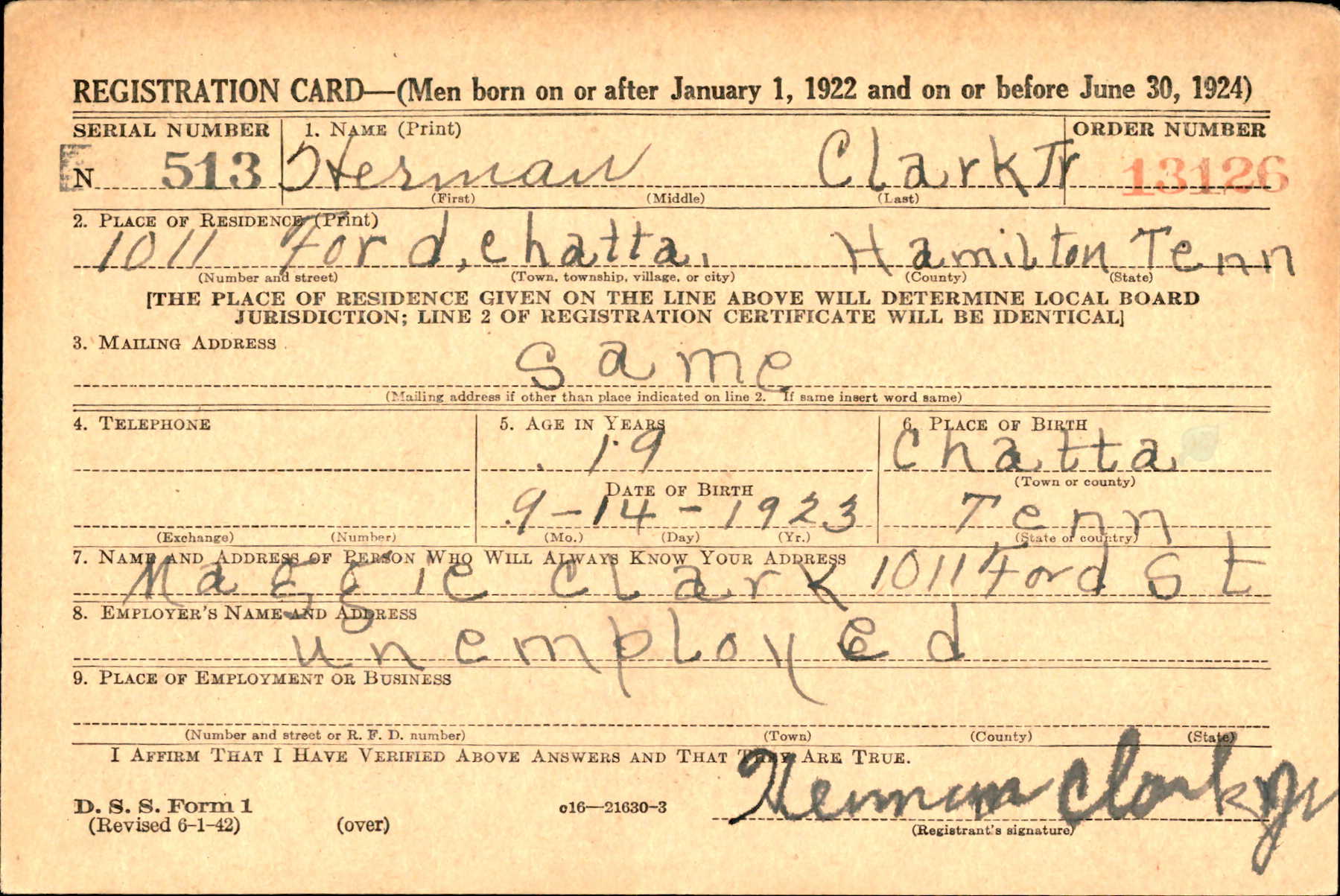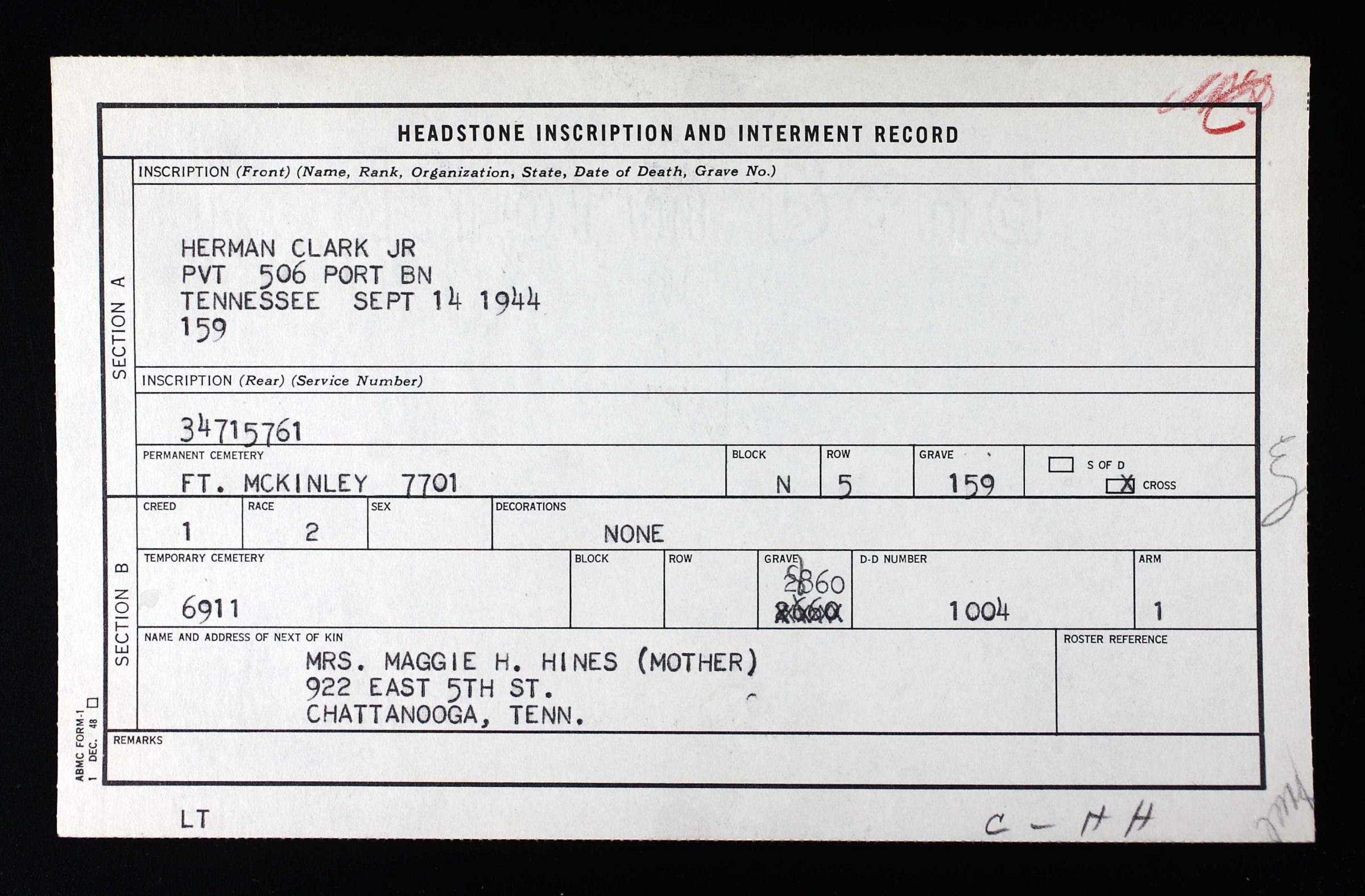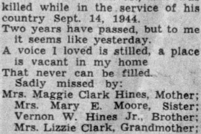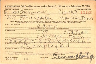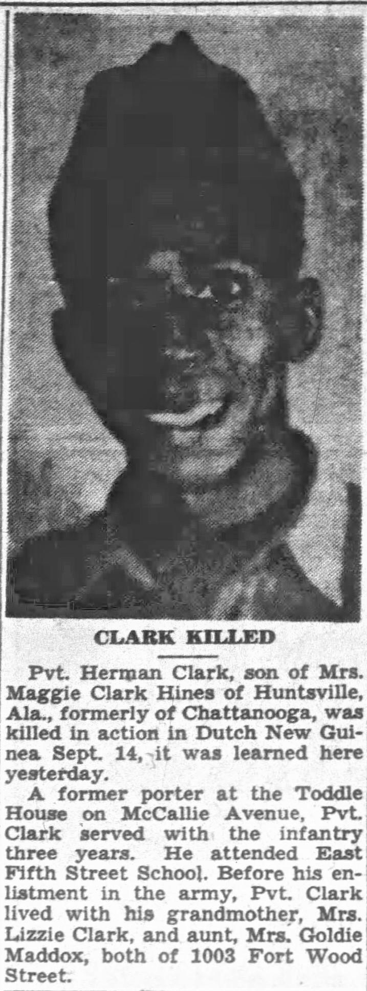 Pvt. Herman Clark, son of Mrs. Maggie Clark Hines of Huntsville, Ala., formerly of Chattanooga, was killed in action in Dutch New Guinea Sept. 14, it was learned here yesterday. A former porter at the Toddle House on McCallie Avenue, Pvt. Clark served with the infantry three years. He attended East Fifth Street School. Before his enlistment in the army, Pvt. Clark lives with his grandmother, Mrs. Lizzie Clark, and aunt, Mrs. Goldie Maddox, both of 1003 Fort Wood Street.