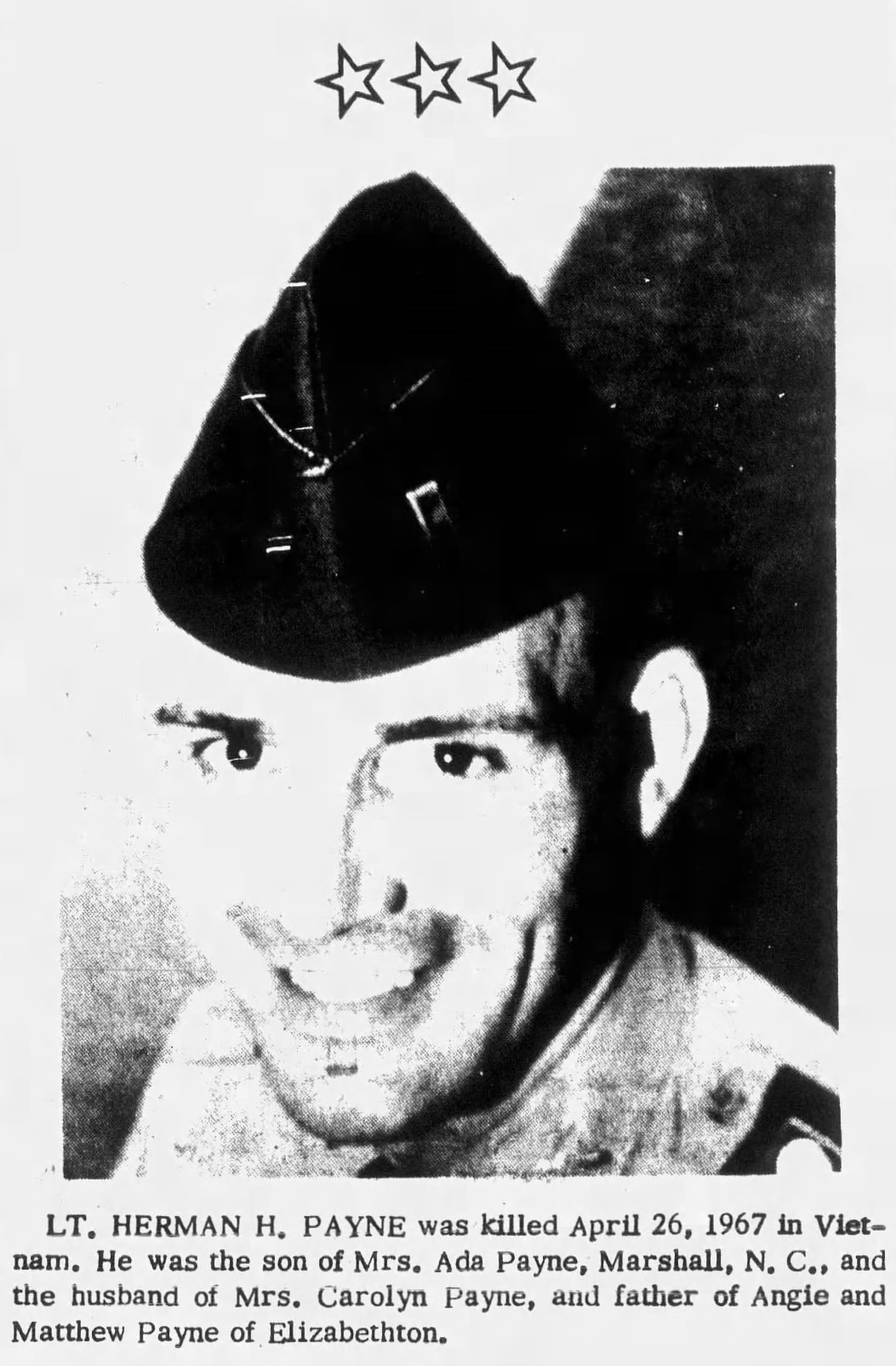 MARSHALL: The Defense Department has announced that a Madison County native was killed in action in Vietnam on April 26th. The victim was killed in combat operations by fragments of exploded booby traps, was listed as 2LT Herman H (Chuck) Payne, 25, of Elizabethton, Tennessee. Payne, a member of Company B, Second Battalion, 9th Infantry Division, had been in Vietnam since December 1966. The son of Mrs Ada Payne of Marshall Route 2, he was a member of Emanuel Baptist Church and Dashiel Masonic Lodge No. 238 in Elizabethton. Payne, in addition to his mother, is survived by the widow, Mrs Carolyn Stanley Hayne, a son, Matthew Scott., and a daughter, Angela Denise Payne, all of the home; a sister, Mrs Mallie Henderson of Marshall; two brothers;, Harry and Barnett Payne, both of Marshall. Payne’s body will be returned to Elizabethton for services and burial under the direction of Hathaway-Percy Funeral Home.