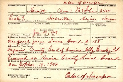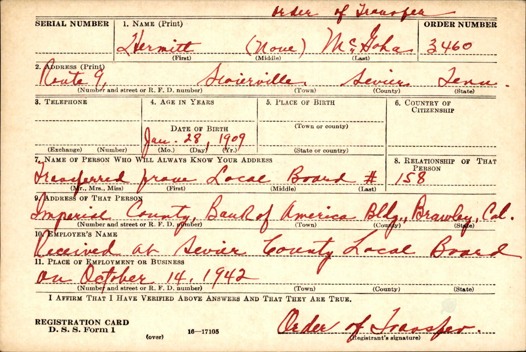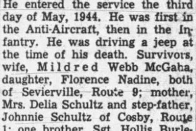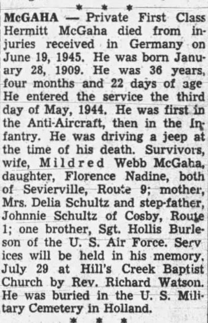 Private First Class Hermitt McGaha died from injuried received in Germany on June 19, 1945. He was born January 28, 1909. He was 36 years, four months and 22 days of age. He entered the service the third day of May, 1944. He was first in the Anti-Aircraft, the in the infantry. He was driving a jeep at the time of his death. Survivors, wife. Mildred Webb McGaha, daughter, Florence Nadine, both of Sevierville, Route 9: mother, Mrs. Delia Schultz and step-father, Johnnie Schultz of Cosby, Route 1; one brother, Sgt. Hollis Burleson of the U.S. Air Force. Services will be held in his memory July 29 at Hill’s Creek Baptist Church. He was buried in the U.S. Military Cemetery in Holland.