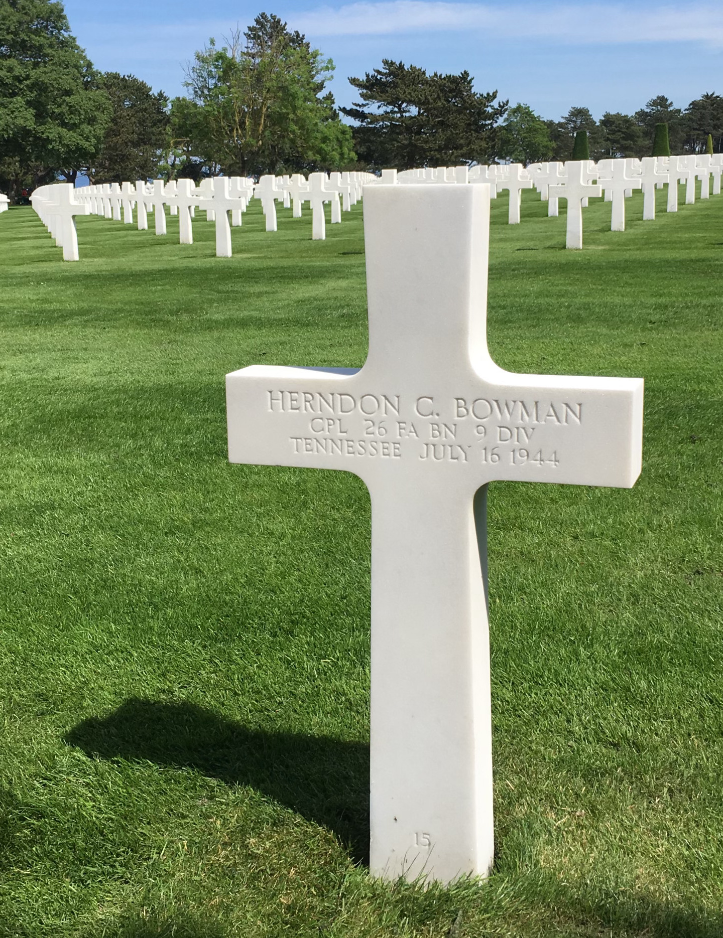 My nephew took it (picture of grave) some time ago, and sent it to me recently because my Dad (his GF) was with the 26th FA, 9th ID. I looked up some records I had — Cpl. Bowman was serving with the Headquarters Battery, 26 FA on that day near Le Désert, Normandy when he was killed by a German mortar round, Several others in his Battery were injured, one seriously, but he was the only fatality. At least two of the guys injured (with him?) that day were also injured later in the war, but as far as I can tell all survived.