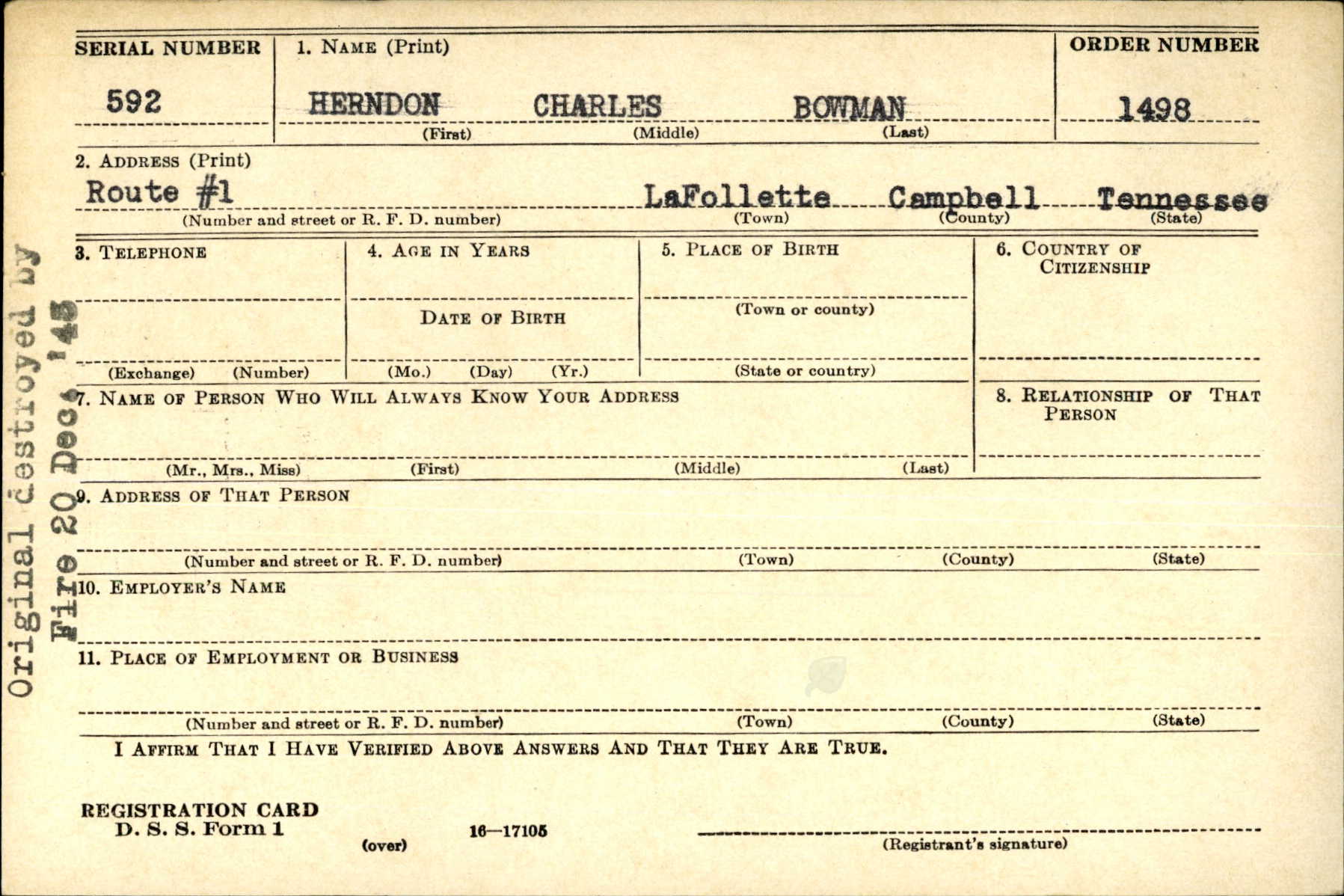 Corporal Herndon Charles Bowman was the son of Hugh E Bowman and Elizabeth Kathern Taylor. He married Ala Liford in 1941.