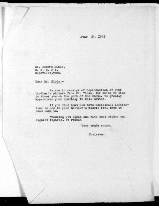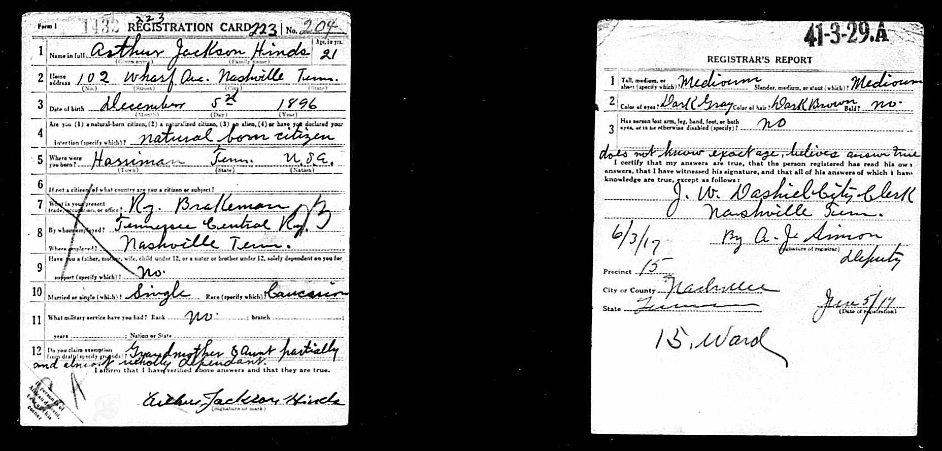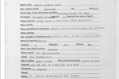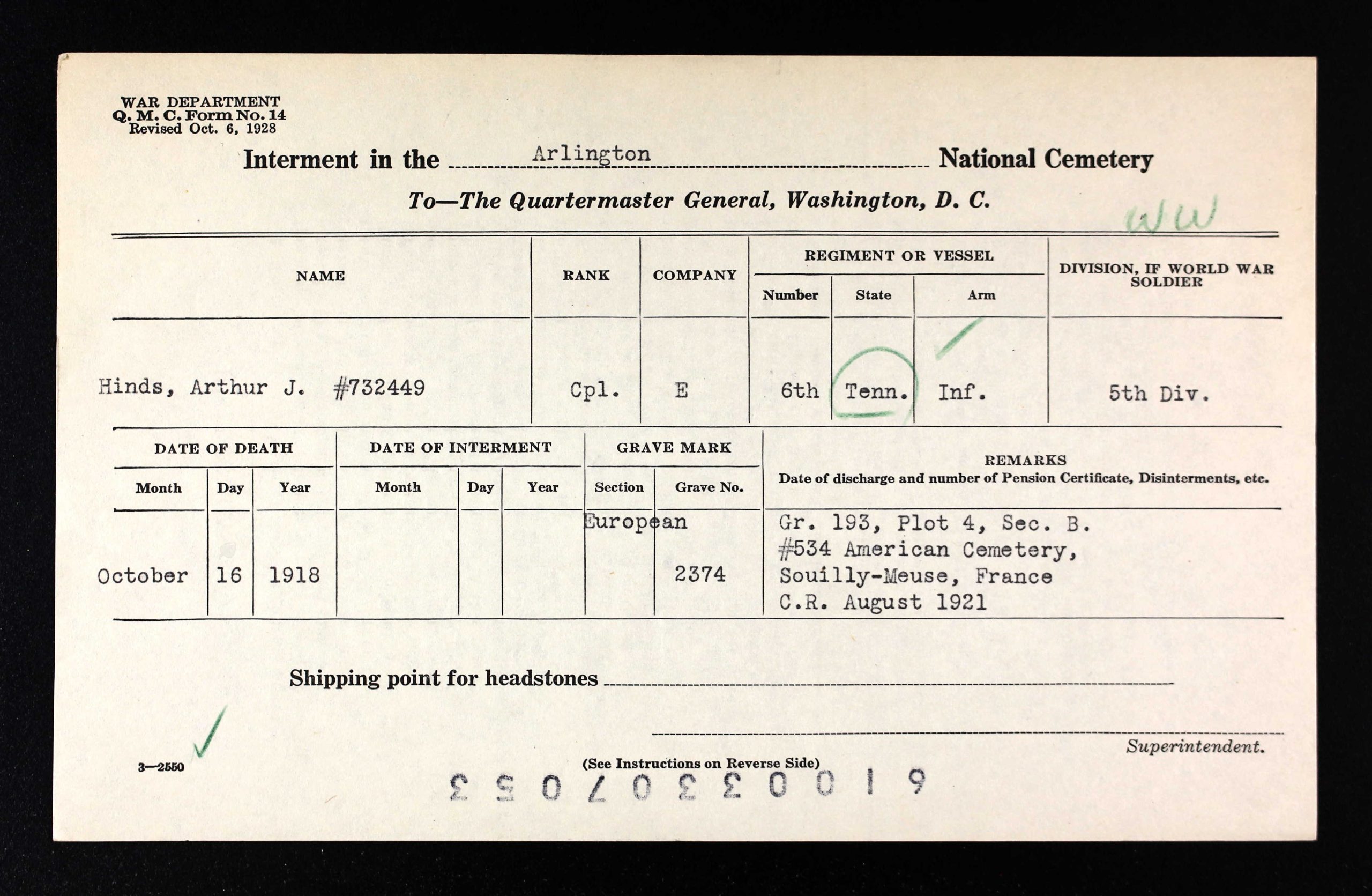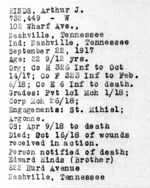 Arthur Jackson Hinds died of wounds in France and was from Harriman, Morgan County, TN.