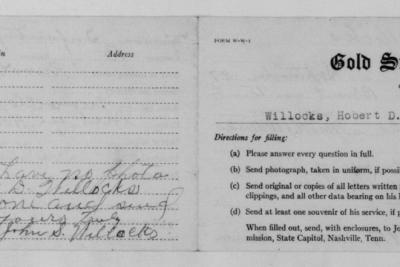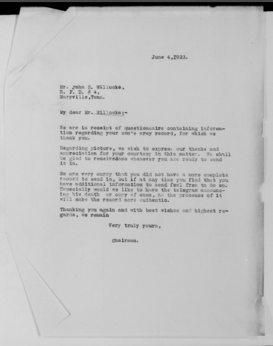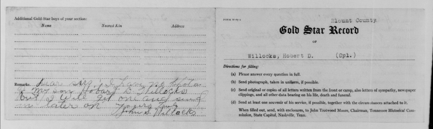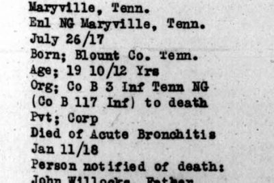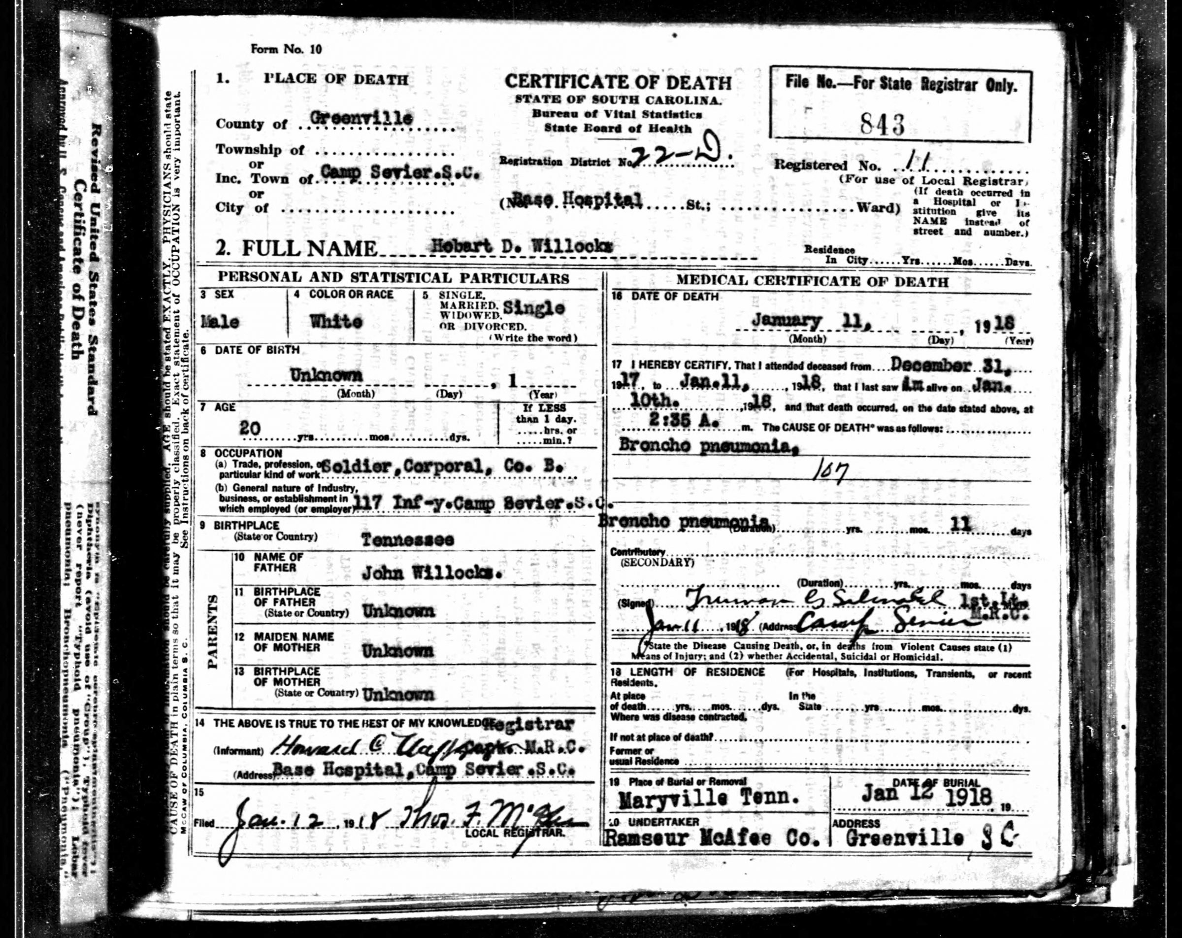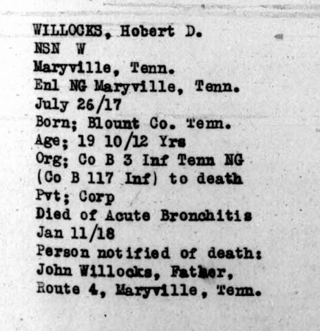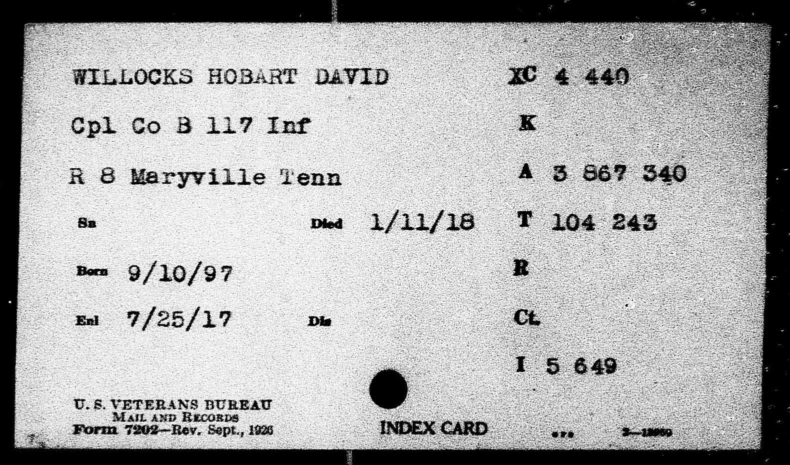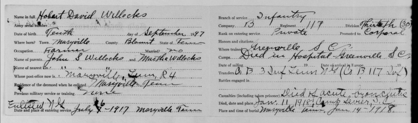 Hobart David Willocks of Maryville, Blount County, was the son of Martha Melvina Gardner and John S. Willocks. A Corporal in Company B, 117th Infantry Regiment of the 30th Division, he died at the Base Hospital while in training at Camp Sevier, Greenville County, South Carolina of acute bronchopneumonia. He is buried in Magnolia Cemetery, Maryville.