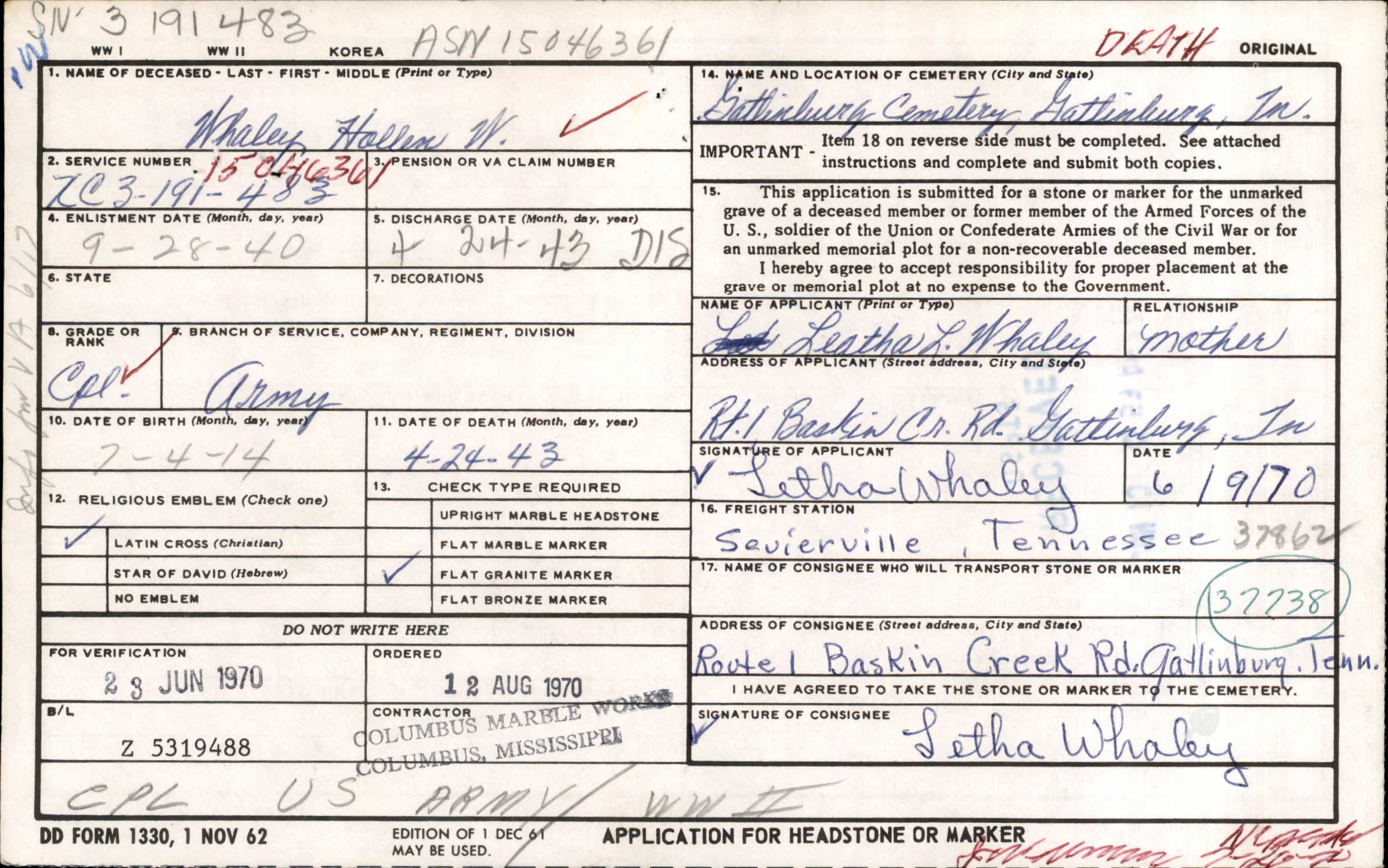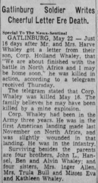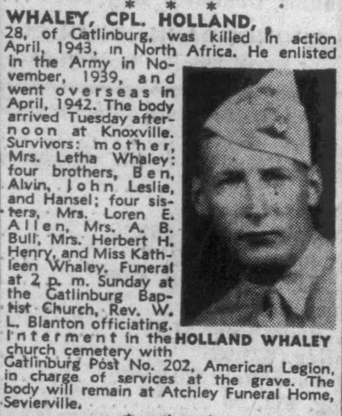 Cpl. Holland Whaley, 28, of Gatlinburg, was killed in action April, 1943 in North Africa. He enlisted in the Army in November, 1939, and went overseas in April, 1942. The body arrived at Knoxville. Survivors: mother, Mrs. Letha Whaley; four brothers, Ben, Alvin, John Leslie and Hansel; four sisters, Mrs. Loren E. Allen, Mrs. A.B. Bull, Mrs. Herbert H. henry and Miss Kathleen Whaley.