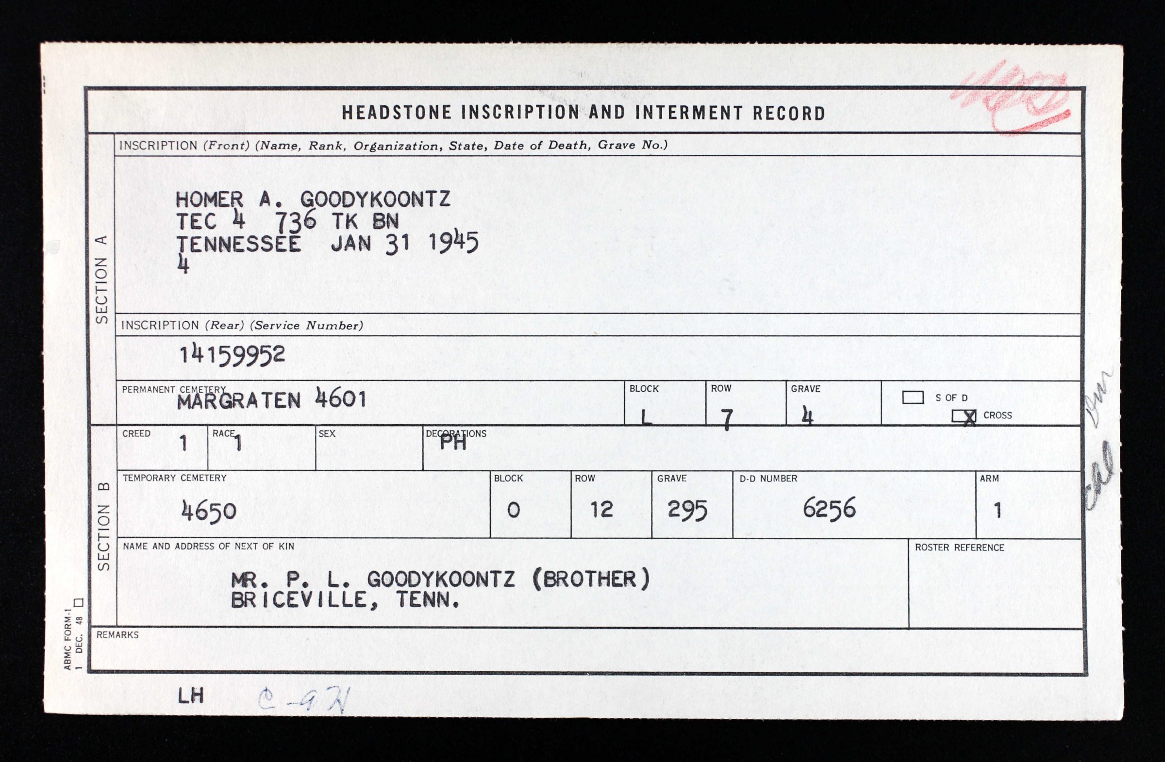 Technician 4th Class Homer Alfred Goodykoontz of Lake City was born around 1923. Technician 4th Class Goodykoontz was the youngest child of Edgar and Lundy Goodykoontz. He was the brother of Prentice L. Goodykoontz, Burnet W. Goodykoontz, Emma T. Goodykoontz, and Chalma R. Goodykoontz. Prior to joining the military, he worked as a farmer. He enlisted on October 25, 1942 in Camp Forrest, Tennessee. He served in the European theater of the war in the 736th Tank Battalion. He was killed in action on Wednesday, January 31, 1945. He is buried in the Netherlands American Cemetery in Margraten (Plot L, Row 7, Grave 4).