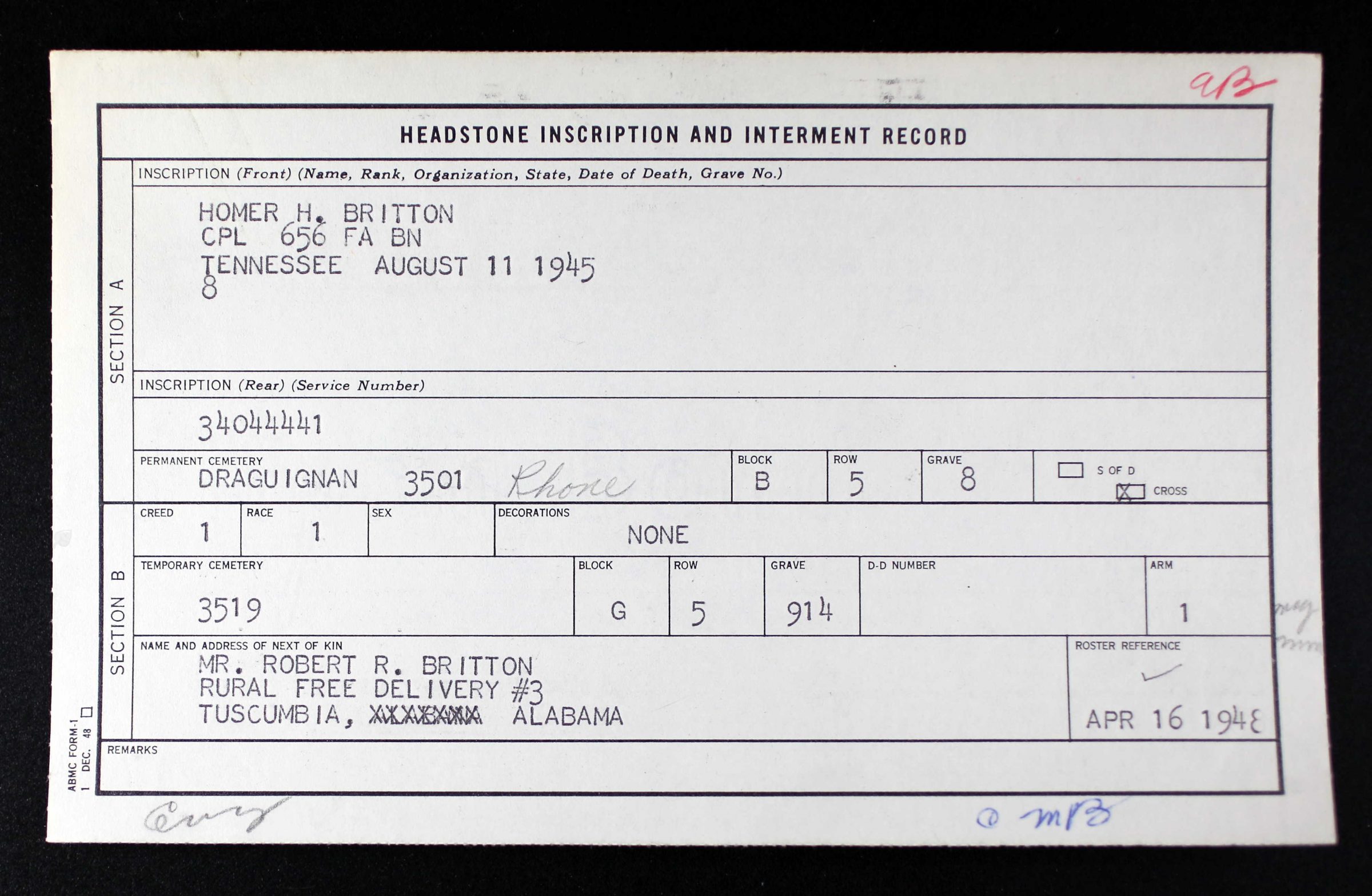 Homer Hillman Britton was born, 8 February 1911 in Belgreen, Alabama. He was the son of Robert Rufus Britton and Mary Magdalene “Maggie” Malone.