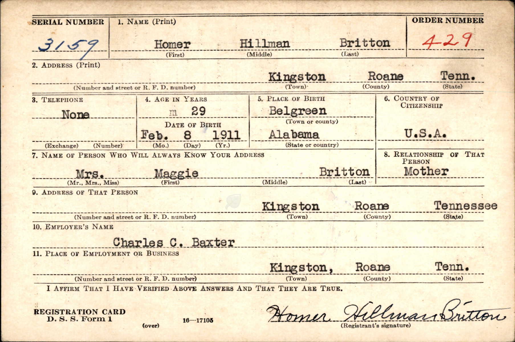 Homer Hillman Britton was born, 8 February 1911 in Belgreen, Alabama. He was the son of Robert Rufus Britton and Mary Magdalene “Maggie” Malone.