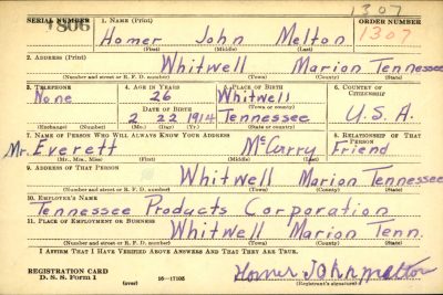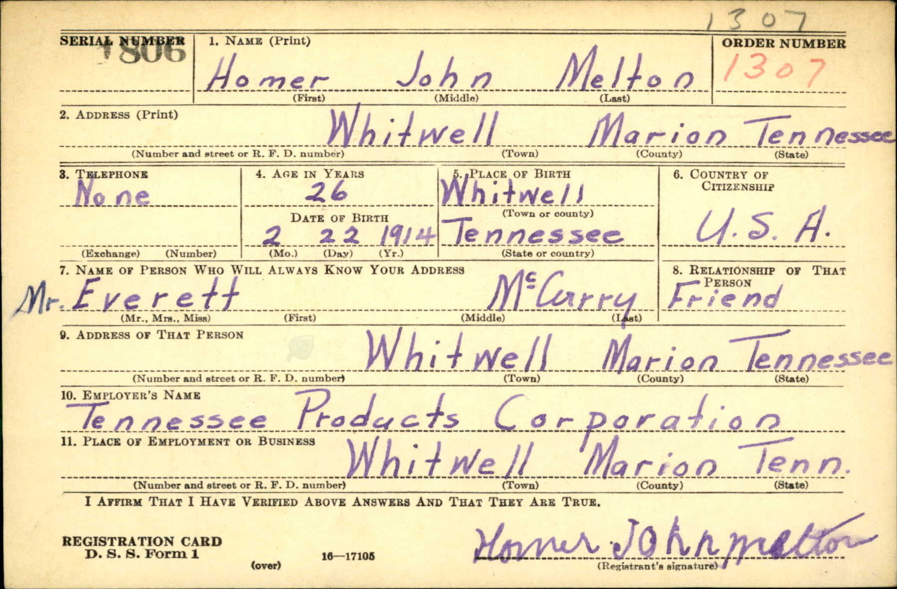 Homer John Melton was born on 22 February 1914, the son of Barney Lee Melton and Minnie L. Martin. He was married to Ethel Mae VanHooser and father John David Melton and Hershel Alexander Melton.