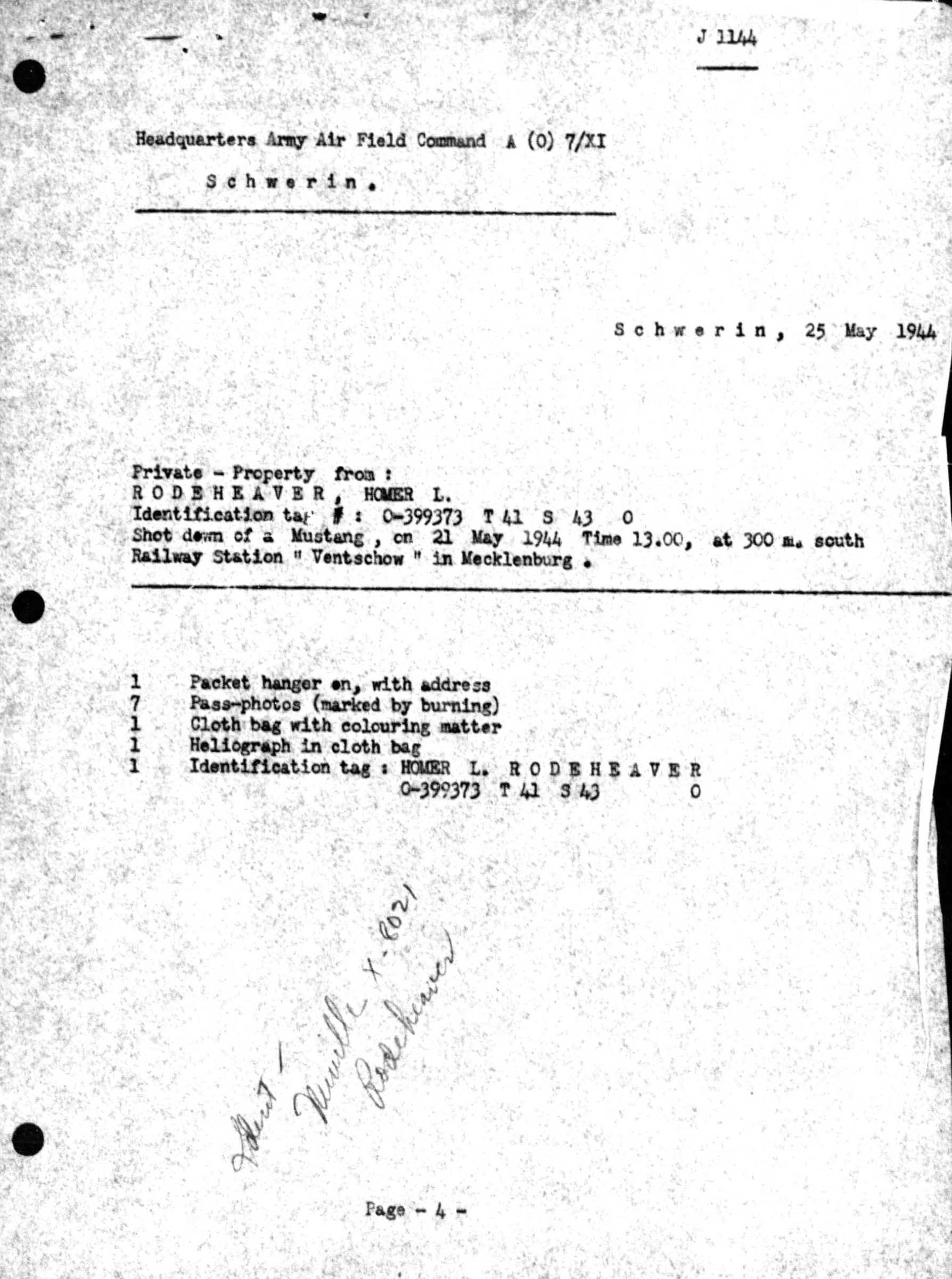 1st Lt Rodeheaver crashed 300 meters south of the Railway Station Ventschow in Mecklenburg, Germany.