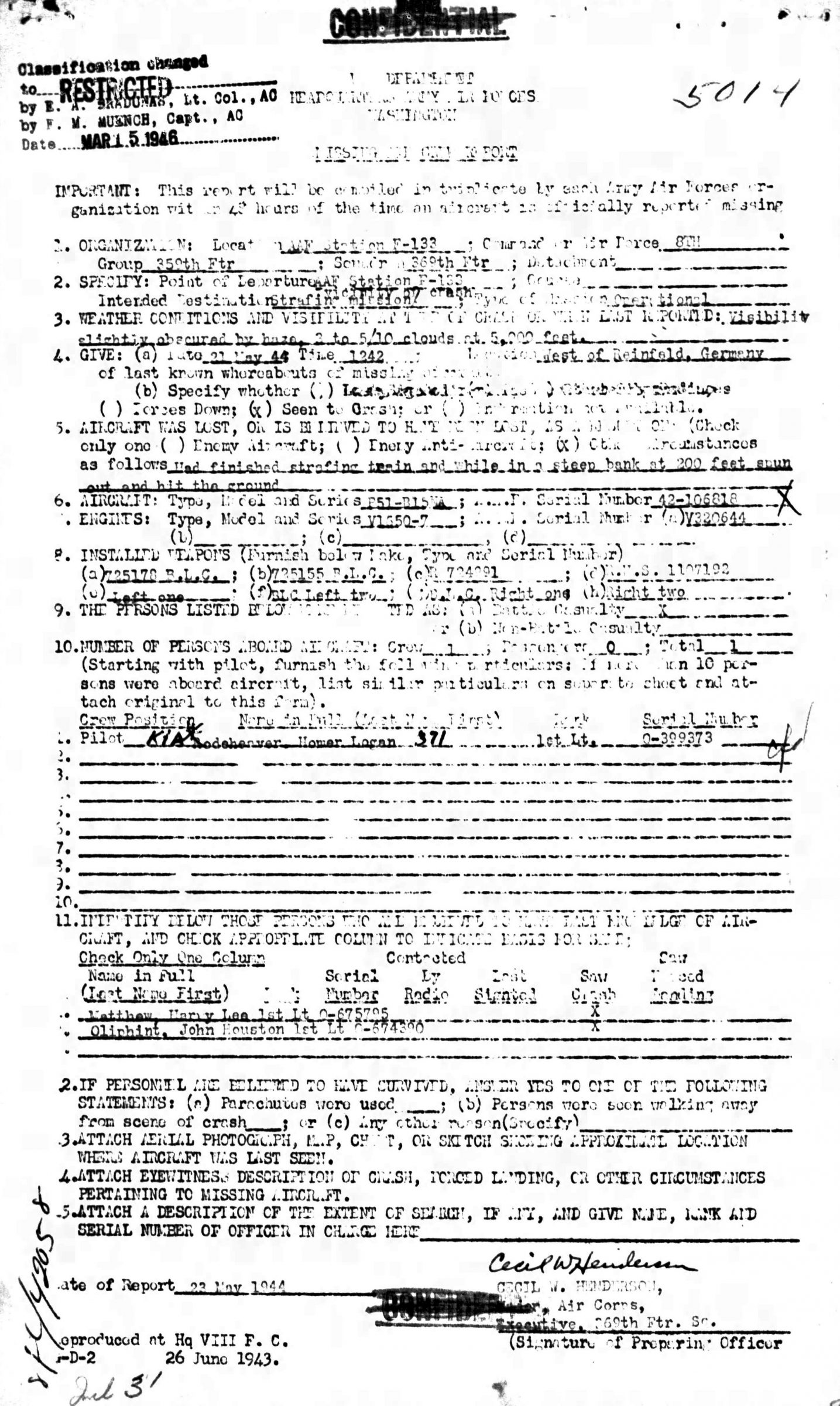 I was flying in string behind 1st Lt Homer L. Rodeheaver while strafing trains in the vicinity of Reinfeld, Germany on 21 May 1944. On our third pass Lt Rodeheaver racked in a tight turn, fired at the locomotive and pulled out violently. At about 100-150 feet he snapped into his back and crashed into the ground at approximately 300 MPH. This occurred at 1242 while we were firing on our second locomotive. Due to the fact that his turns were much tighter than mine, I am quite sure that his accident was due to loss of control in his quick pull-out because of gasoline in his fuselage tank. There was absolutely no ground fire coming up, so I am sure almost he was just turning too tightly.