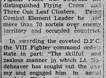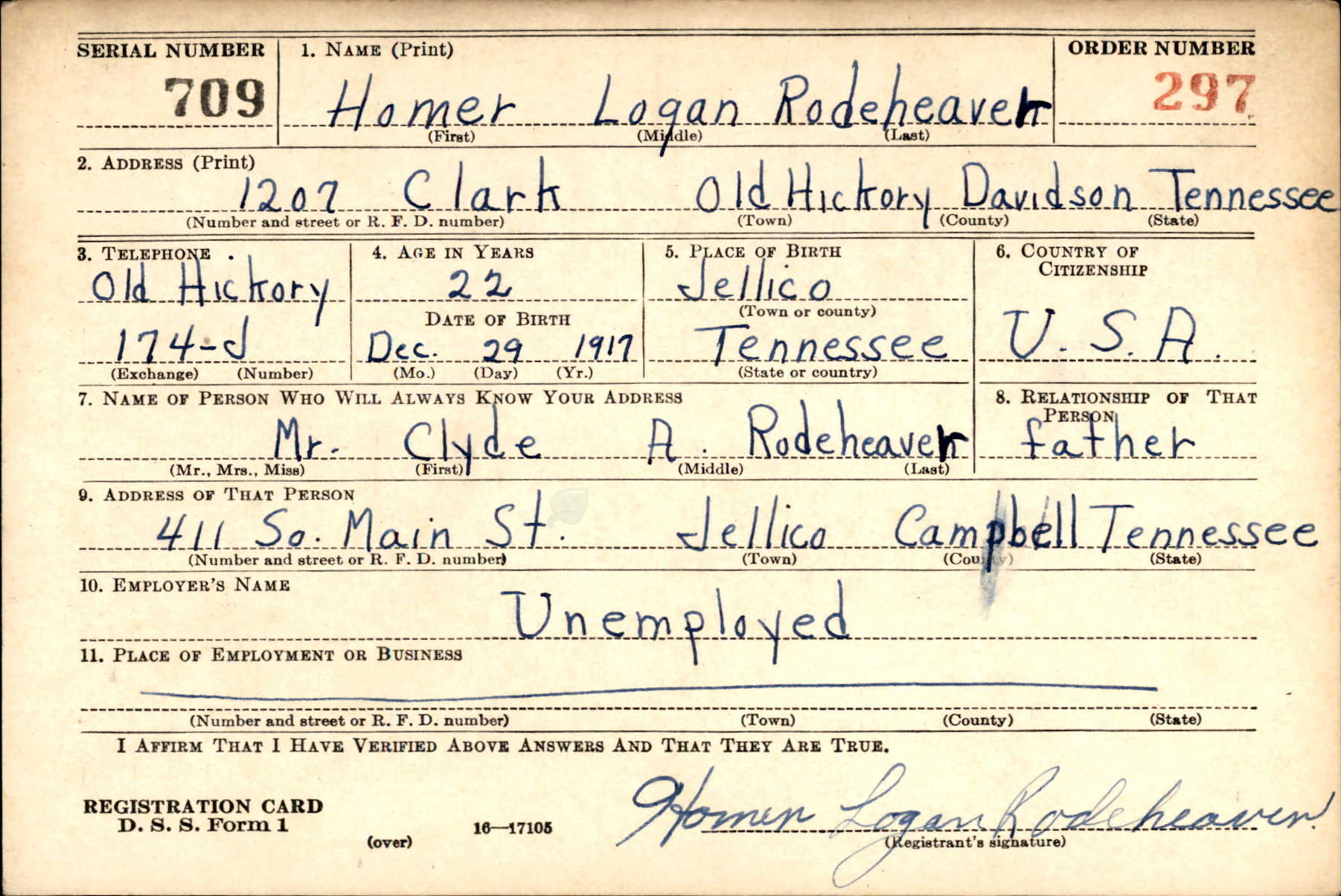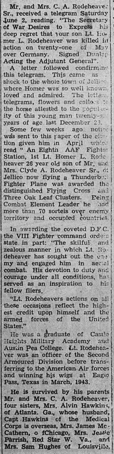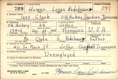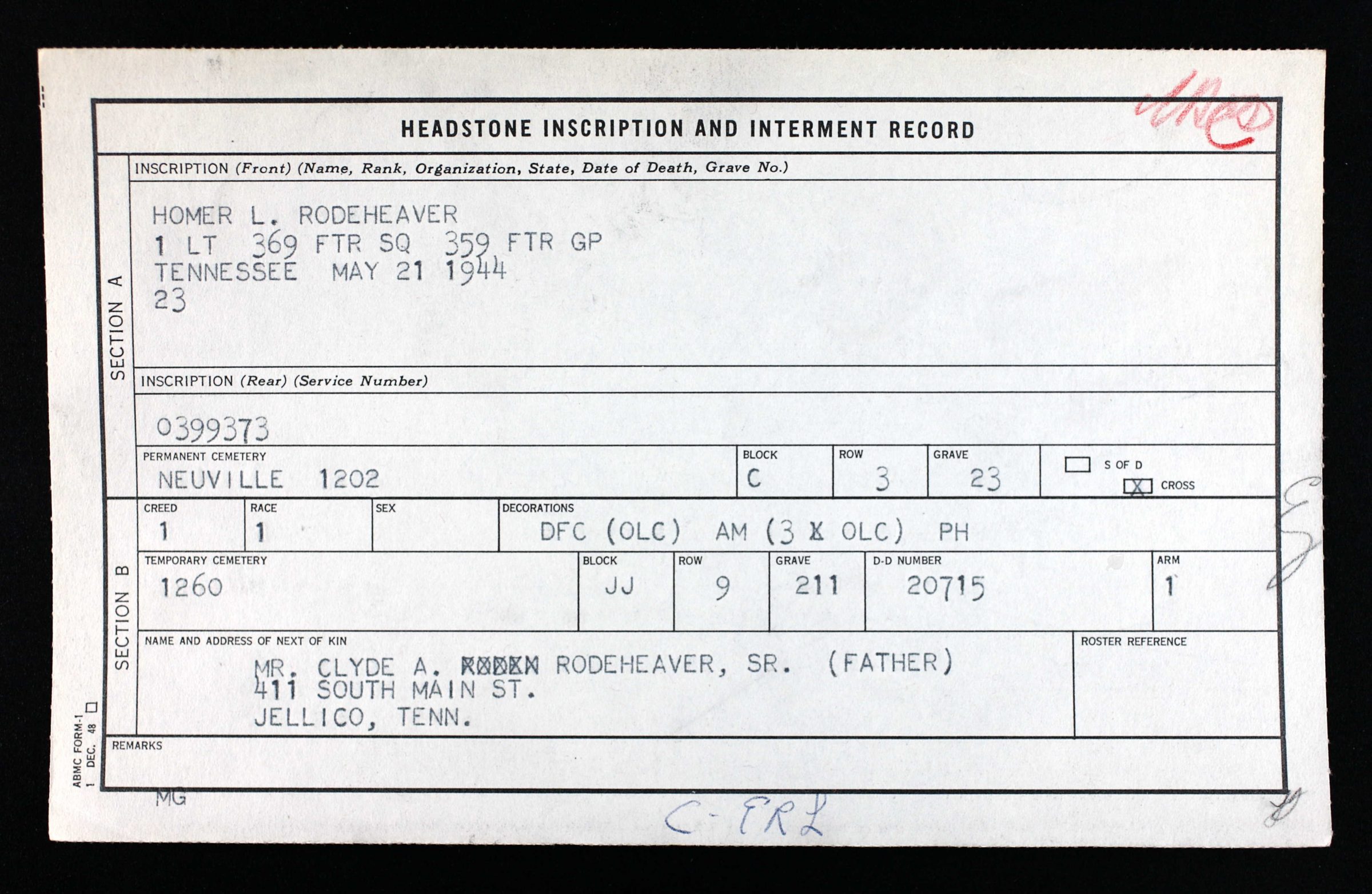 Homer Logan Rodeheaver was born 1918 in Campbell County, Tennessee. His parents were Clyde Alzy Rodenheaver and Ella Logan. He served as a 1st Lt. with 369th Fighter Squadron, 359th Fighter Group. He received the Distinguished Flying Cross with Oak Leaf Cluster, Air Medal with 3 Oak Leaf Clusters. He died 21 May 1944 and is buried in Ardennes American Cemetery, Neupre, Belgium. Plot C Row 3 Grave 23.