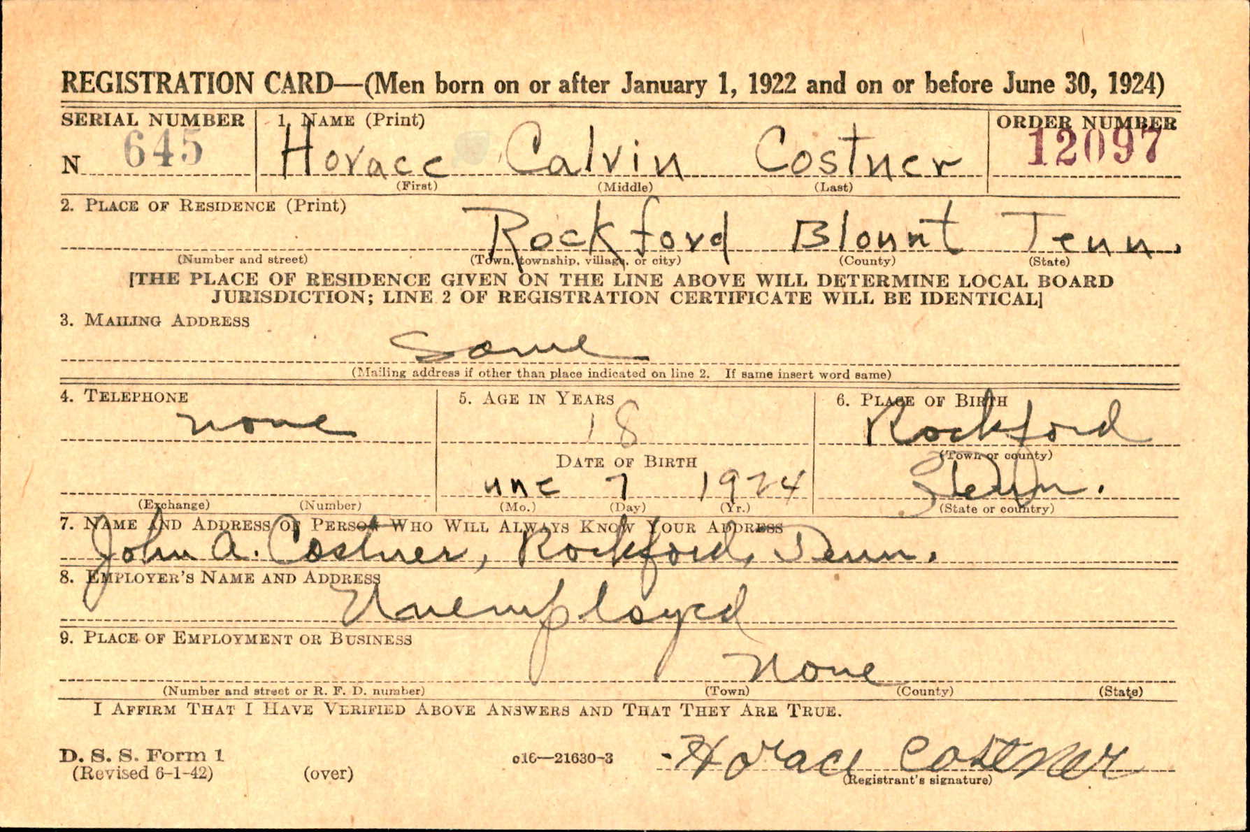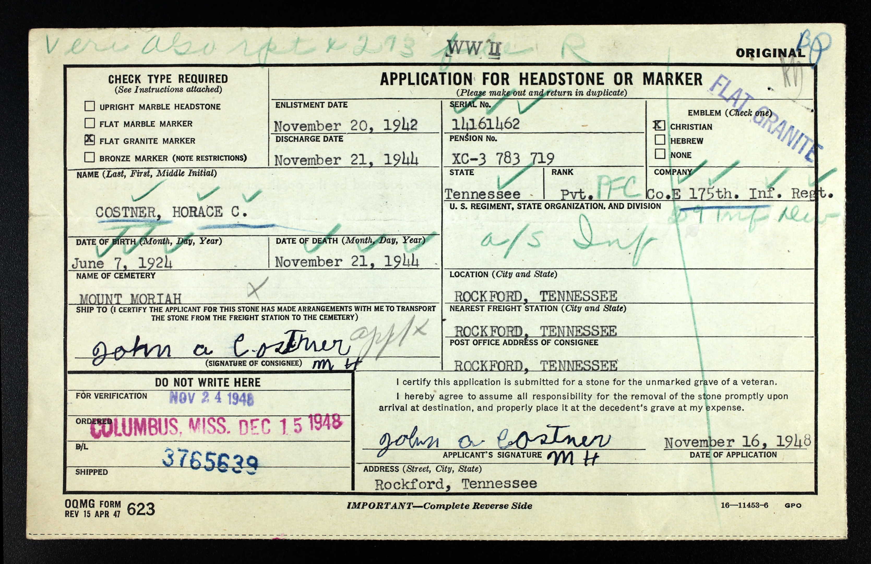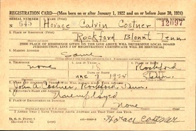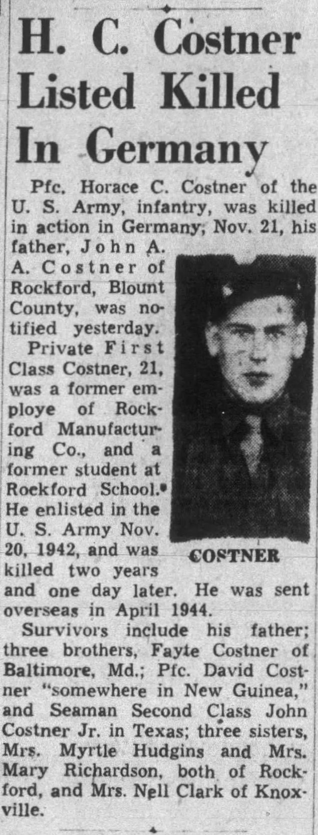 Pfc. Horace C. Costner of the U.S. Army, infantry, was killed in action in Germany, Nov. 21, his father, John A. Costner of Rockford, Blount County, was notified yesterday. Private First Class Costner, 21, was a former employe of Rockford Manufacturing Co., and a former student at Rockford School. He enlisted in the U.S. Army Nov. 20, 1942, and was killed two years and one day later. He was sent overseas in April 1944. Survivors include his father; three brothers, Fayte Costner of Baltimore, Md.; Pfc. David Costner “somewhere in New Guinea,” and Seaman Second Class John Costner Jr. in Texas; three sisters, Mrs. Myrtle Hudgins and Mrs. Mary Richardson, both of Rockford, and Mrs. Nell Clark of Knoxville.