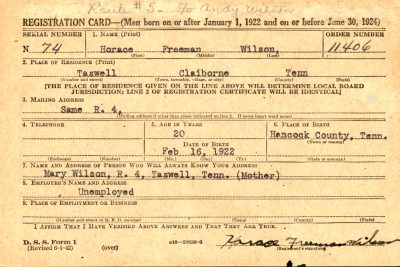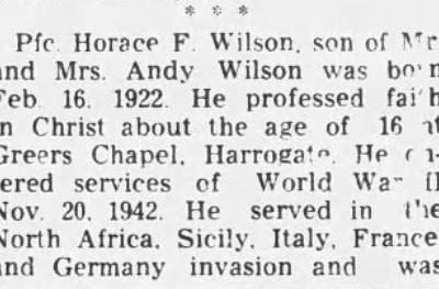 Horace Freeman Wilson was born 16 February 1922 in Hancock County, Tennessee, the son of Andy Wilson and Mary Ruth Moore. Husband of illian Ivy “Lily” Fowler and father of Horace Freeman “Artie” Wilson Jr.