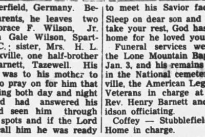Horace Wilson was initially buried at Margraten War Cemetery, the Netherlands. He is now buried in Knoxville National Cemetery, Plot: Section B, Plot 6586, Row 41