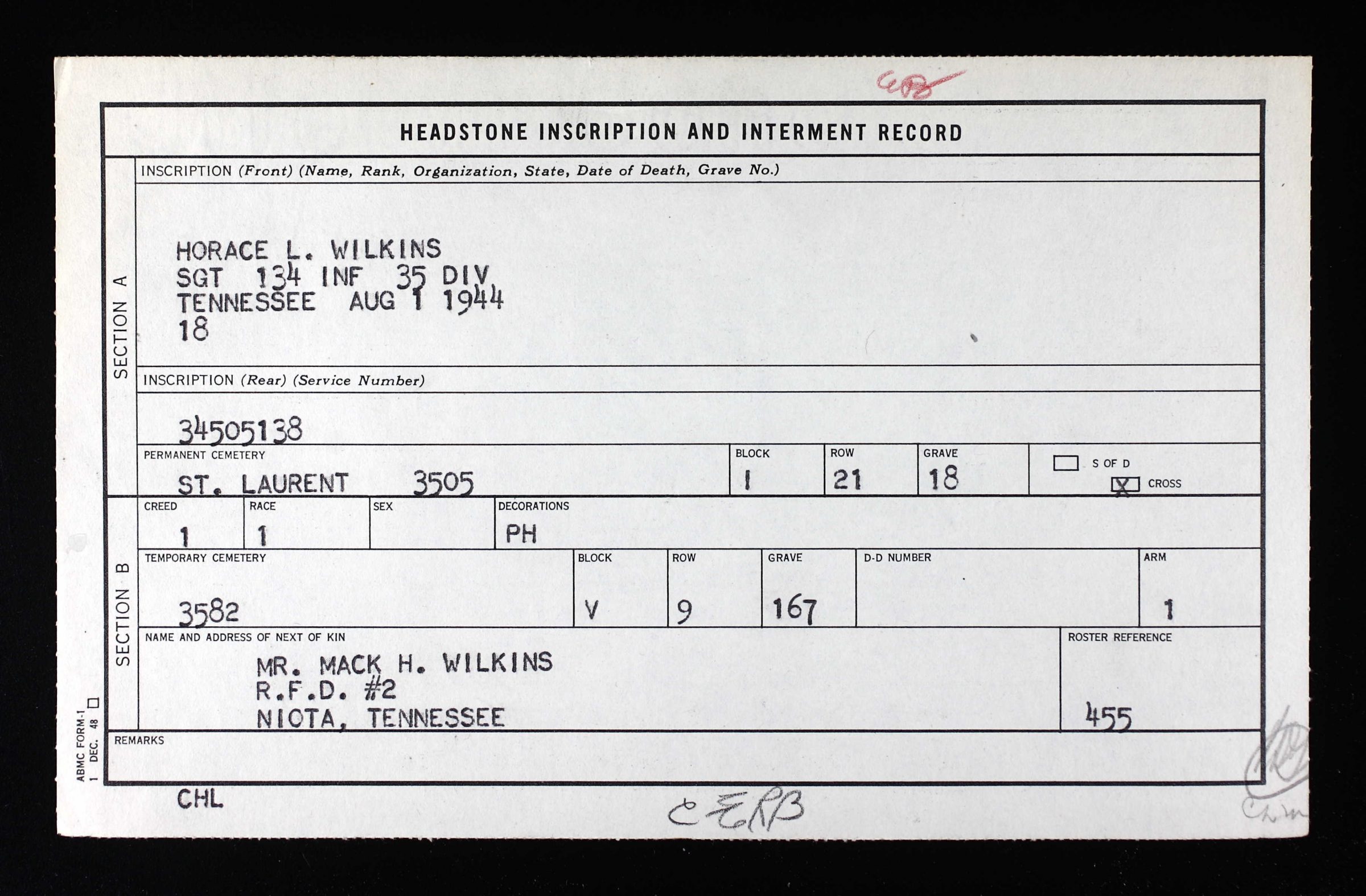 Sergeant Horace L. Wilkins #34505138 was serving in the 134th Infantry Regiment, 35th Infantry Division. At the time of his death the 134th was advancing from St-Lo, France towards Vire. He died on 1 August 1944. He was initially buried at Saint Laurent Cemetery at Baveux, France and reburied at Normandy American Cemetery, St-Laurent-sur-Mer, France, I,21,18.