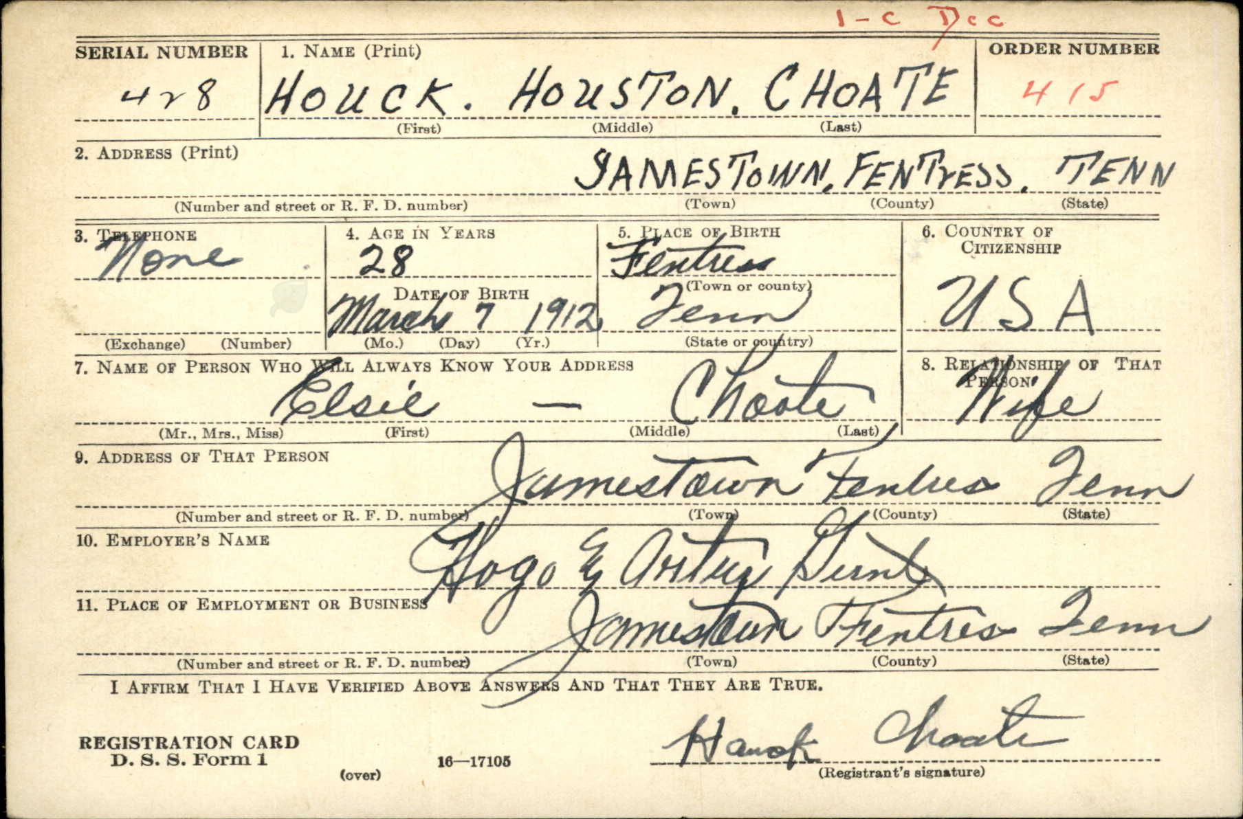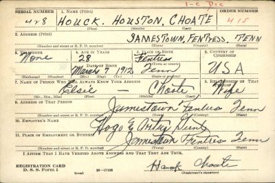 Houck Houston Choate was the son of Rufus Choate and Sarah Jane Hood. Husband of Elsie Leona Owens and father of Betty Choate.