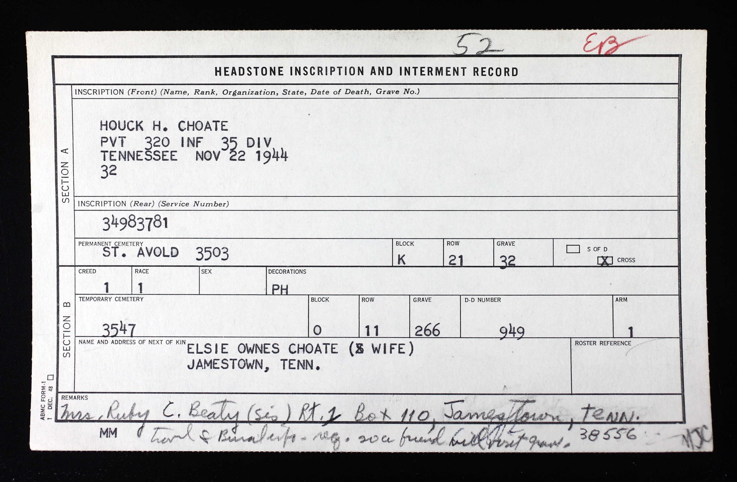 Buried at Lorraine American Cemetery, St. Avold, France, K, 21, 32