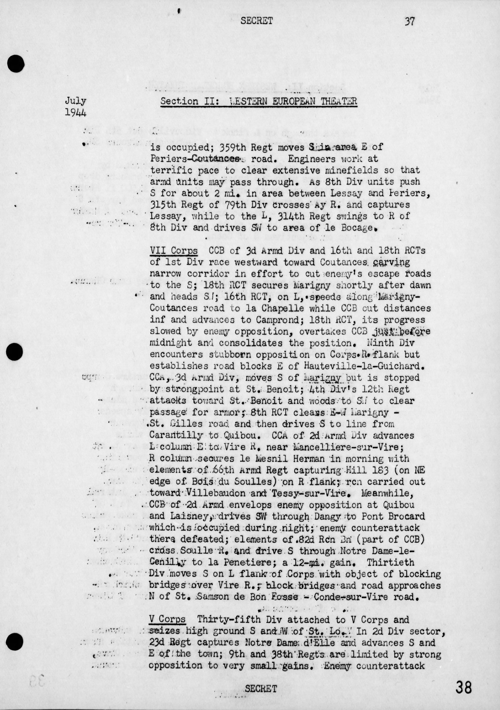 The 2nd Armored Division moved from Normandy to St-Lo towards Canisy and established road blocks from St. Denis-le-Gast to the Seine River on 29 July 1944 according to war diaries.