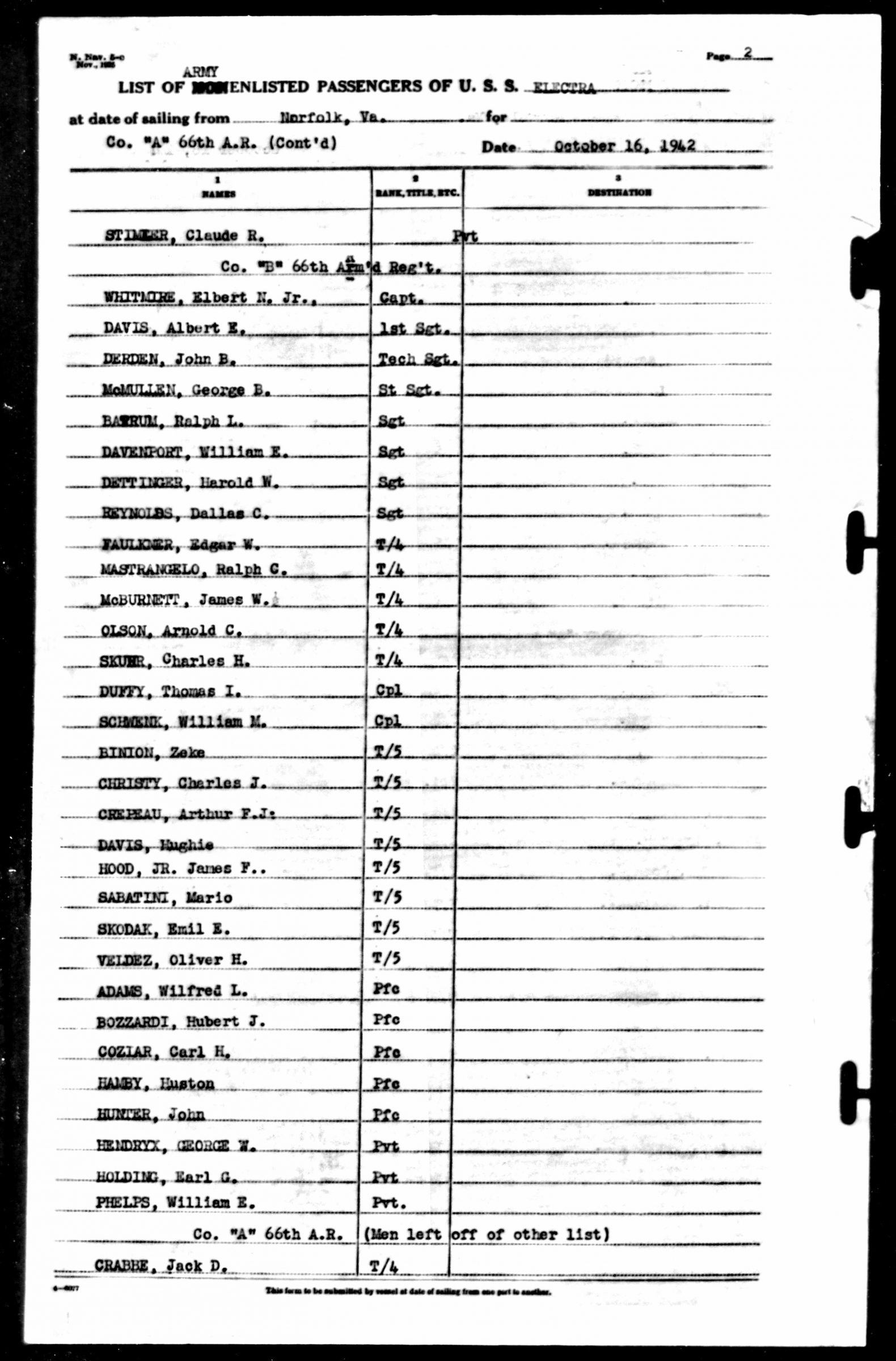He was a passenger on the U.S.S. Electra leaving from Norfolk, Virginia on 16 October 1942.
