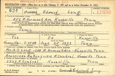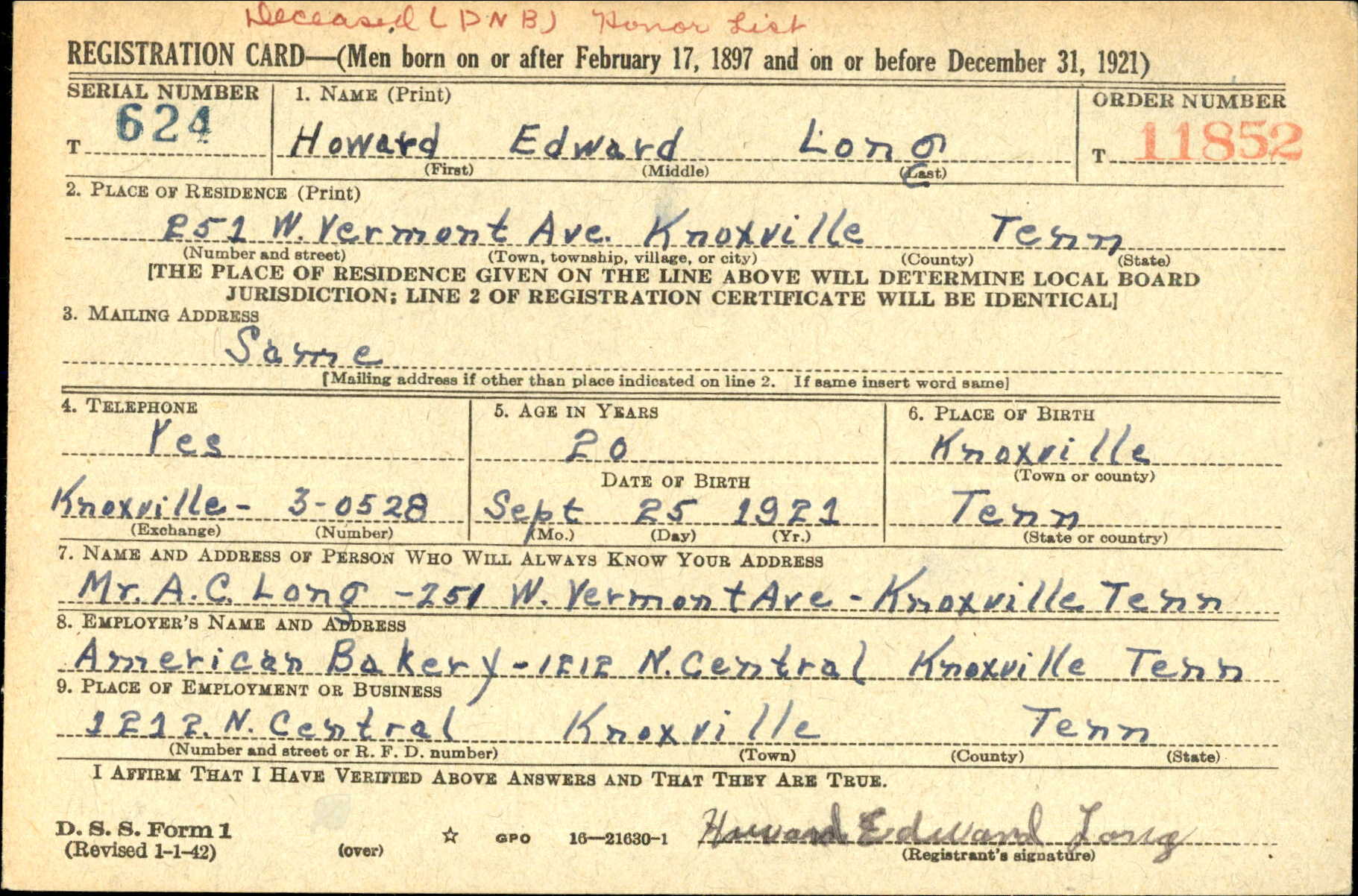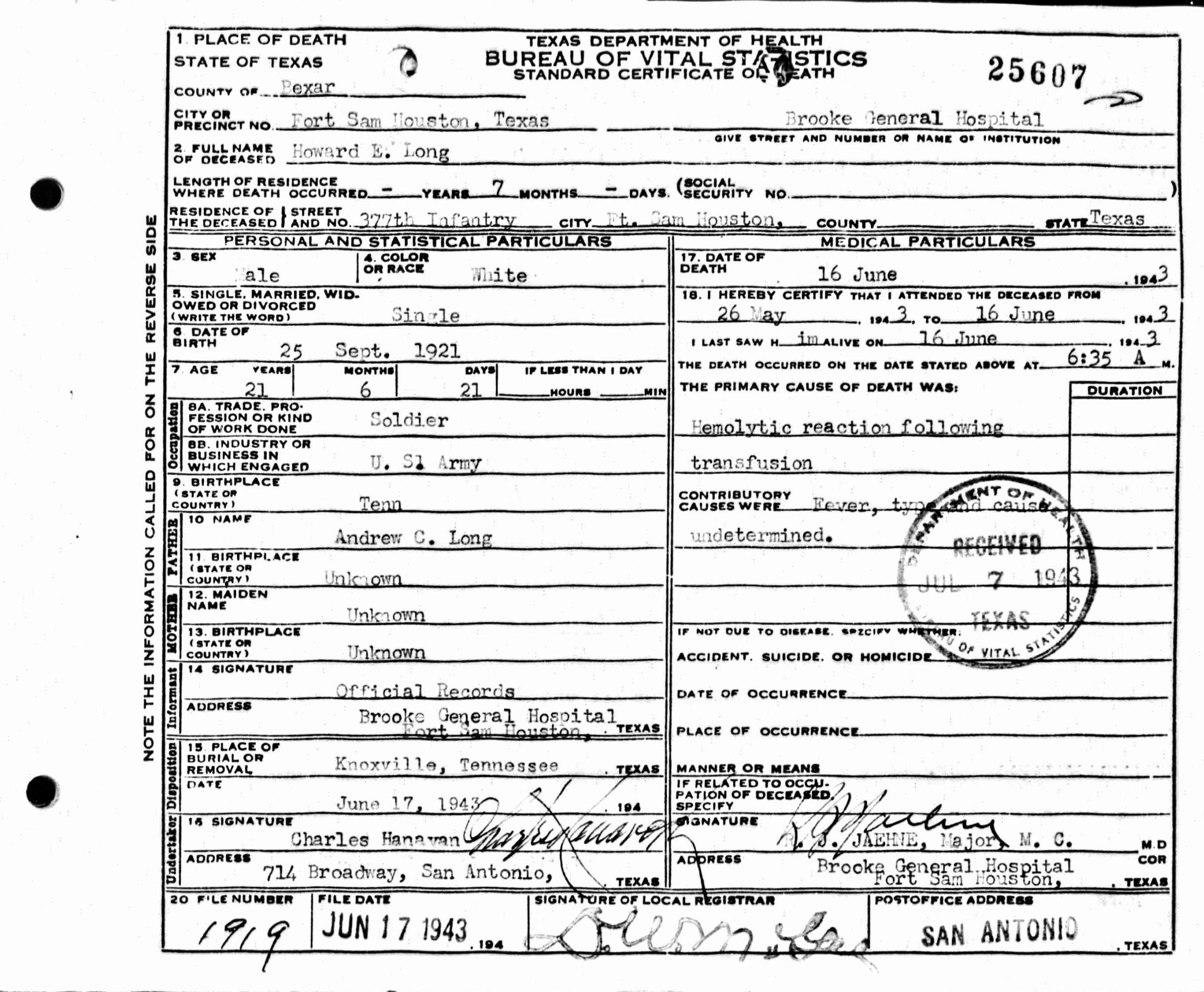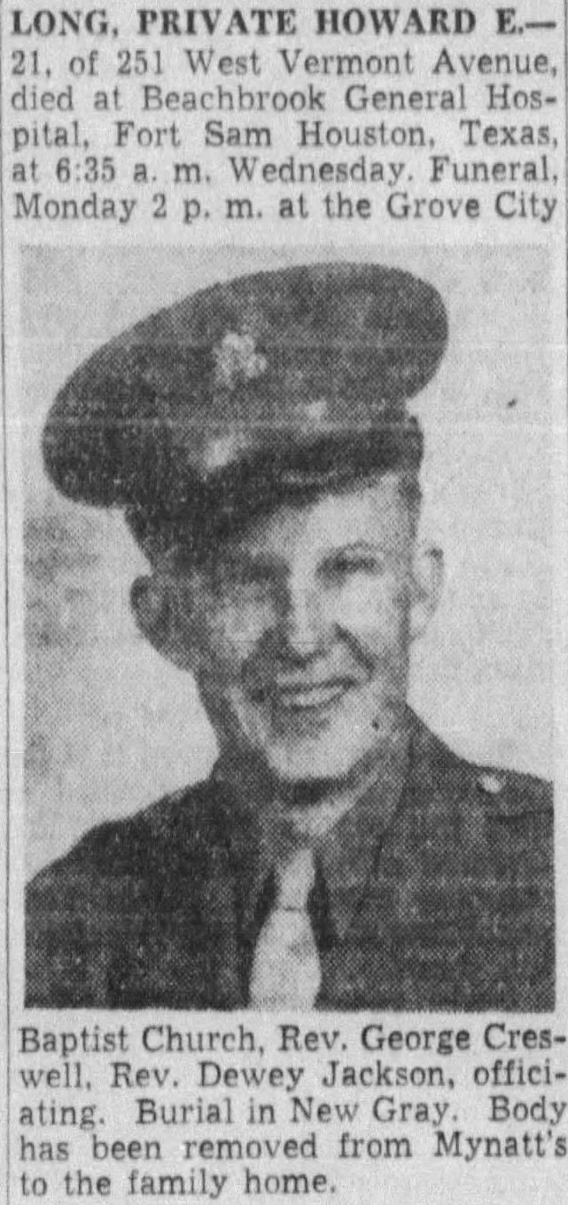 Howard Edward Long was born on 25 September 1921 to Andrew Cowan Long and Lizzie Horsely. He was the brother of Ruby Ellen Long. Pvt. Long enlisted on September 8, 1942, in Fort Oglethorpe, GA. He Died non Battle 16 June 1943 at Brooke General Hospital, Fort Sam Houston, Bexas County, Texas of Hemolytic reaction following a transfusion.