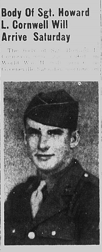 The body of Sgt. Howard L. Cornwell, who was killed in World War II , will arrive in Greeneville. Sgt. Corwell was inducted into the service on July 3, 1942, and was killed in action on May 23, 1944, at the age of 24. Besides his parents, he is survived by one brother, Clark Cornwell, one sister, Mrs. Carl Ricker, and his grandmothers, Mrs. Laura Cornwell and Mrs. Jennie Crum.