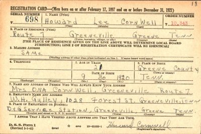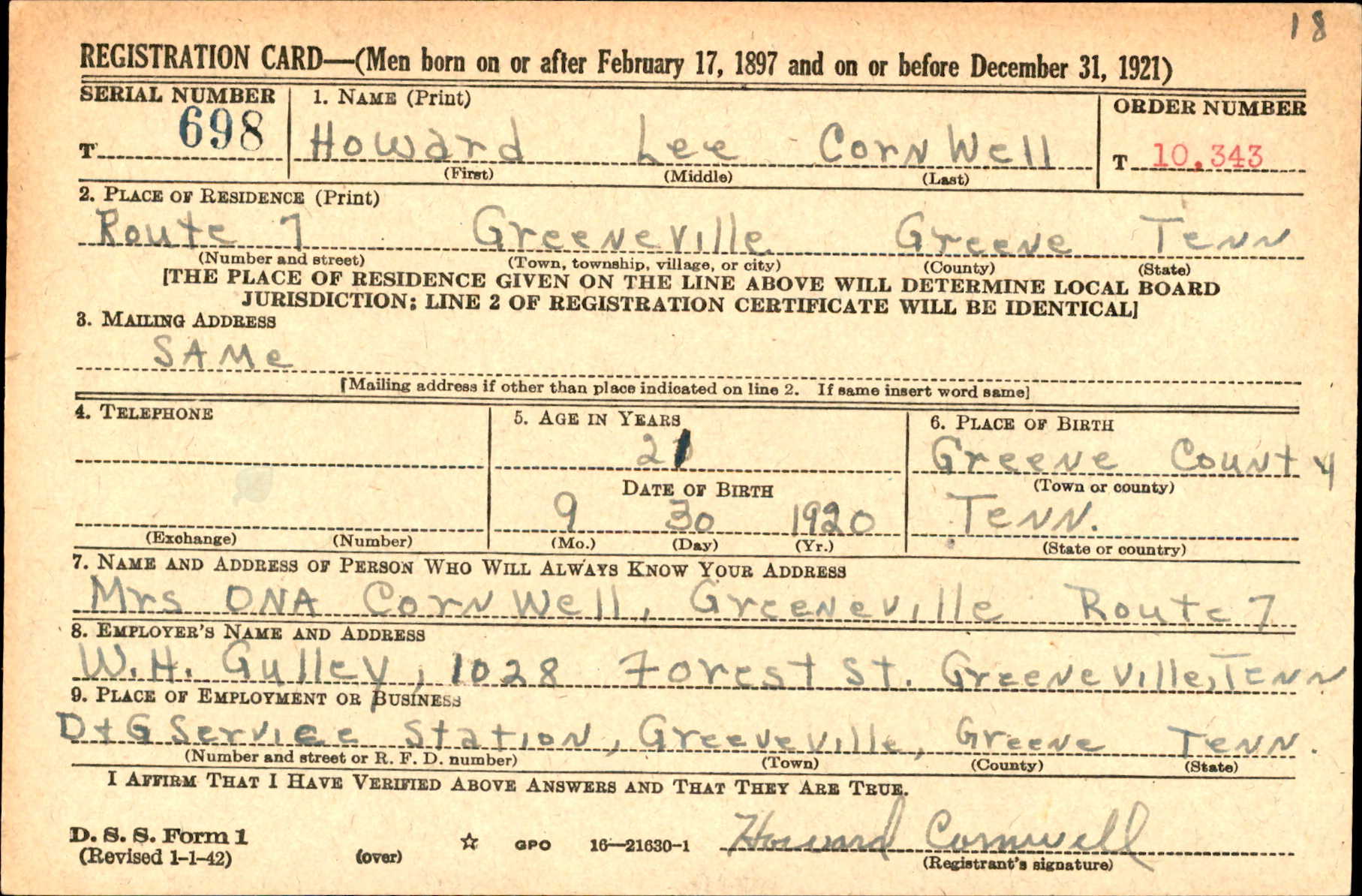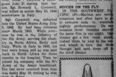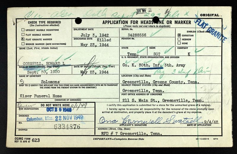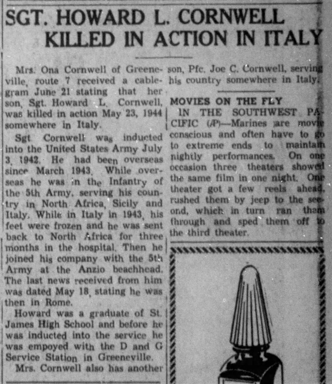 Mrs. Ona Cornwell of Greeneville, route 7 received a cablegram June 21, stating that her son, Sgt. Howard L. Cornwell, was killed in action May 23, 1944 somewhere in Italy. Sgt. Cornwell was inducted into the United States Army July 3, 1942. He had been overseas since March 1943. While overseas he was in the Infantry of the 5th Army, serving his country in North Africa, Sicily and Italy. While in Italy in 1943, his feet were frozen and he was sent back to North Africa for three months in the hospital. Then he joined his company with the 5th Army at the Anzio beachhead. The last news received from him was dated May 18, stating he was then in Rome. Howard was a graduate of St. James High School and before he was inducted into the service he was employed with the D and G Service Station in Greeneville. Mrs. Cornwell also has another son, Pfc. Joe C. Cornwell, serving his country somewhere in Italy.