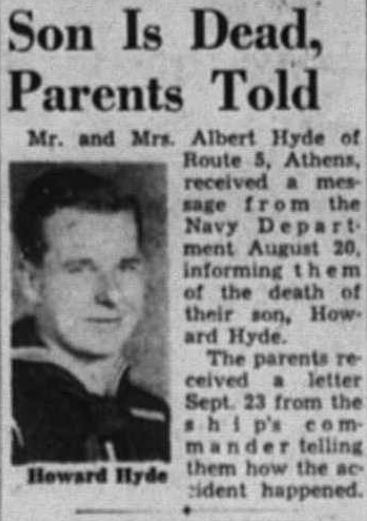 Howard Hyde died at sea in the Pacific area. He was attached to the U.S.S. Raleigh.