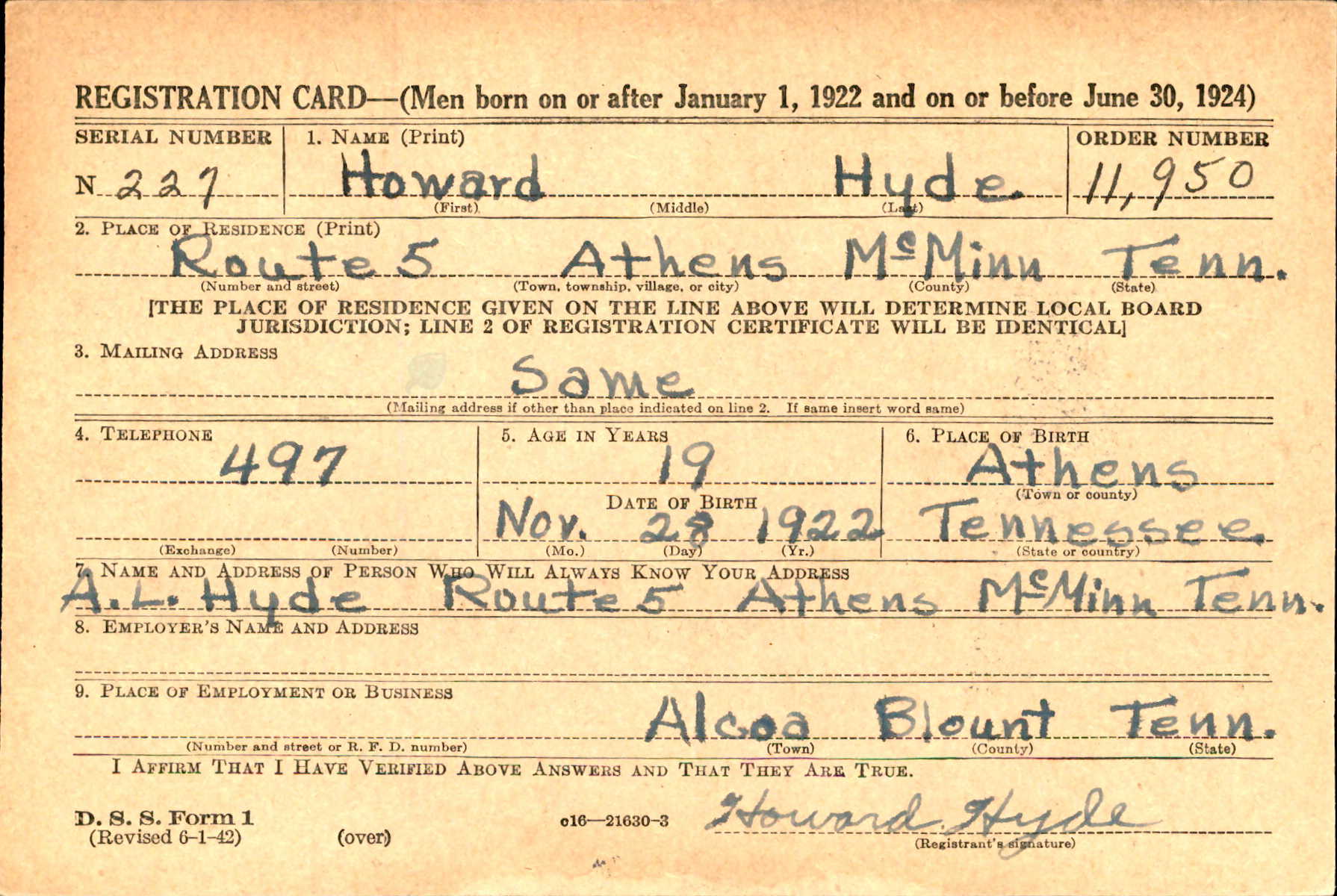 Howard L. Hyde was born 28 November 1922 in Athens, Tennessee. He was the son of Albert Loranzy Hyde and Tempie Kirby.