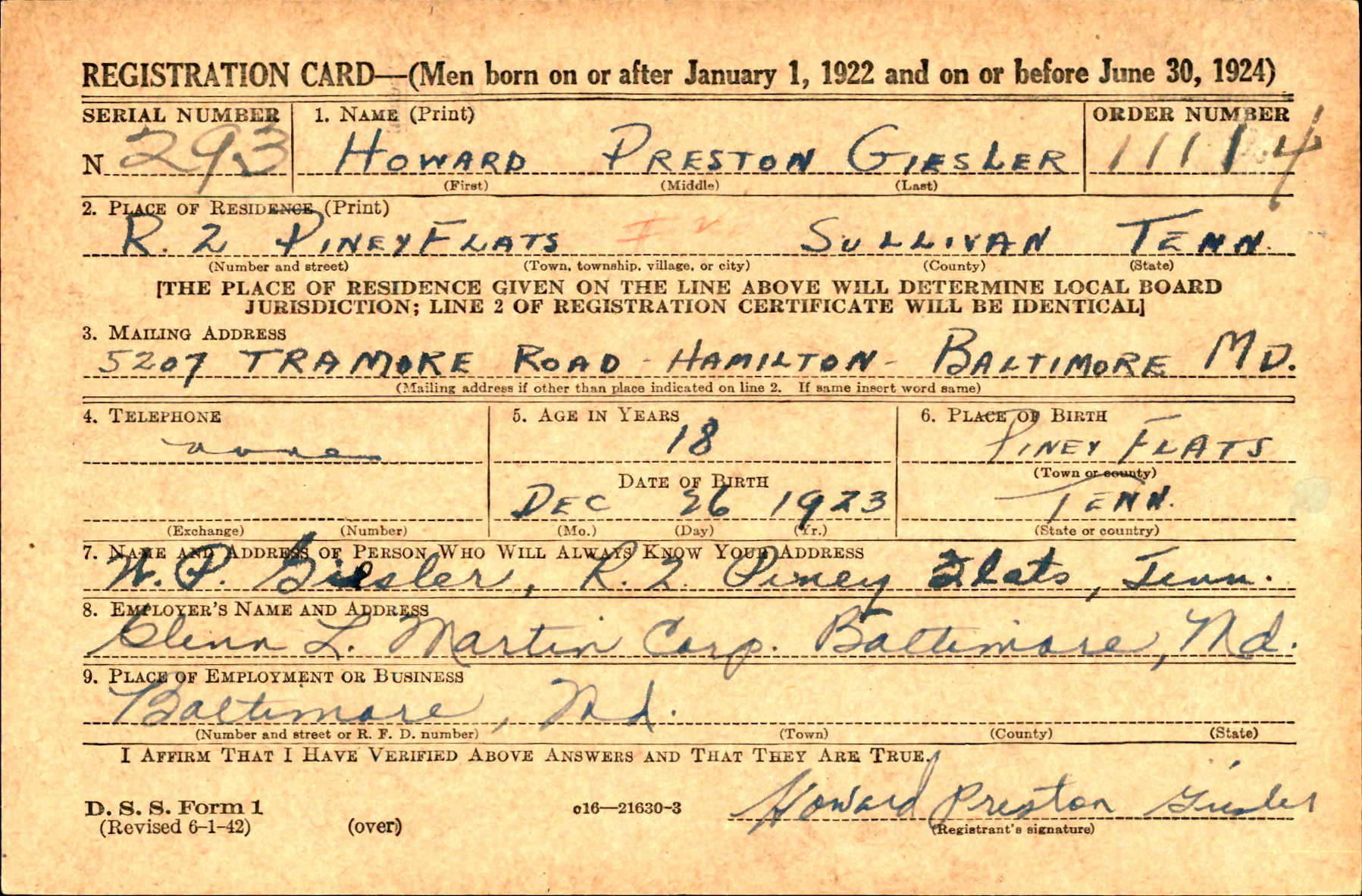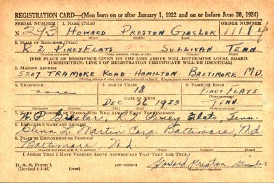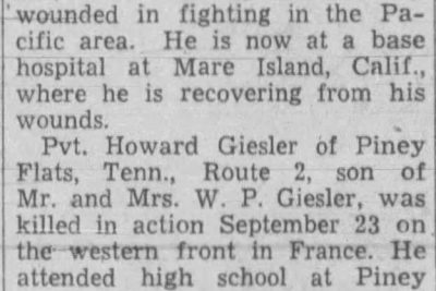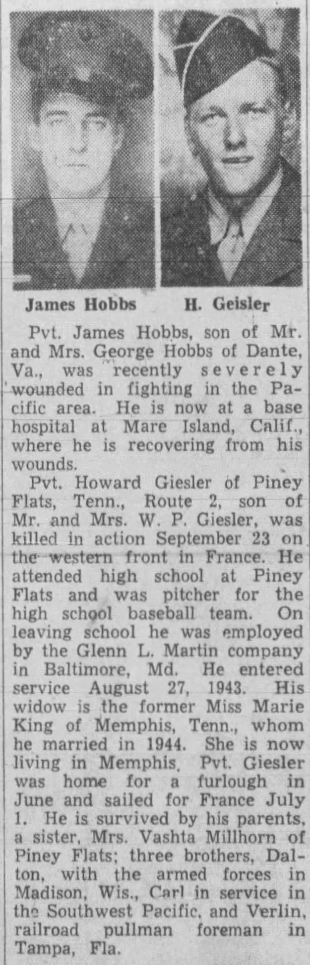Pvt. Howard Giesler of Piney Flats, Tenn., Route 2, son of Mr. and Mrs. W.P. Giesler, was killed in action September 23 on the western front in France. He attended high school at Piney Flats and was pitcher for the high school baseball team. On leaving school he was employed by the Glenn L. Martin company in Baltimore, Md. He entered service August 27, 1943. Hiw widow is the former Miss Marie King of Memphis, Tenn., whom he married in 1944. She is now living in Memphis. Pvt. Giesler was home for a furlough in June and sailed for France July 1. He is survived by his parents, a sister, Mrs. Vashta Millhorn of Piney Flats; three brothers, Dalton, with the armed forces in Madison, Wis., Carl in service in the Southwest Pacific, and Verlin, railroad pullman foreman in Tampa, Fla.