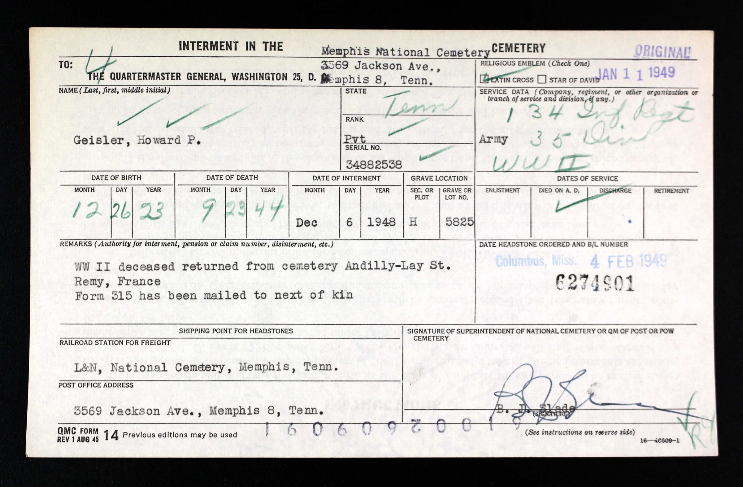 Interment date – 6 December 1948 at Memphis National Cemetery, Memphis, TN, Section H, Site 5825