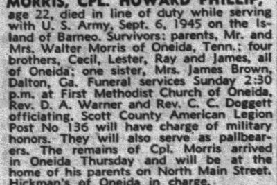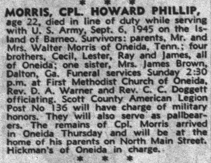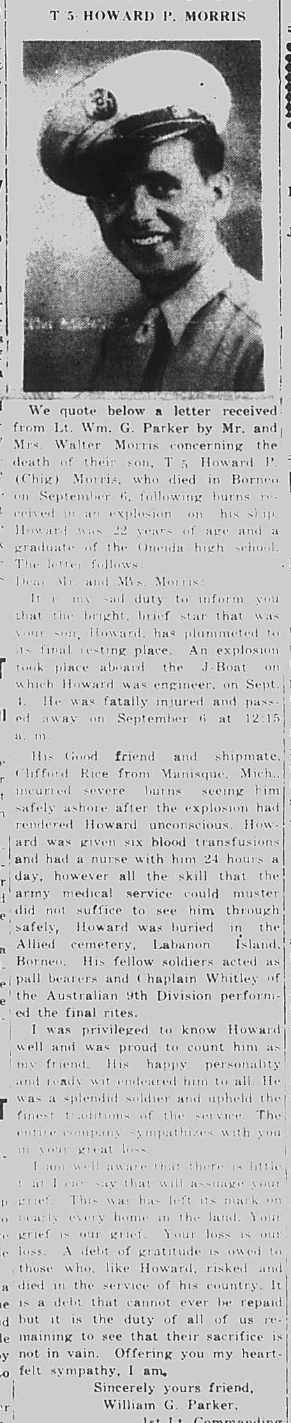 We quote a letter received from Lt. Wm. G. Parker by Mr. and Mrs. Walter Morris concerning the death of their son, T5 Howard P. (Chig) Morris, who died in Borneo on September 6, following burns received in an explosion of his ship. Howard was 22 years of age and a graduate of Oneida High School. The letter follows: