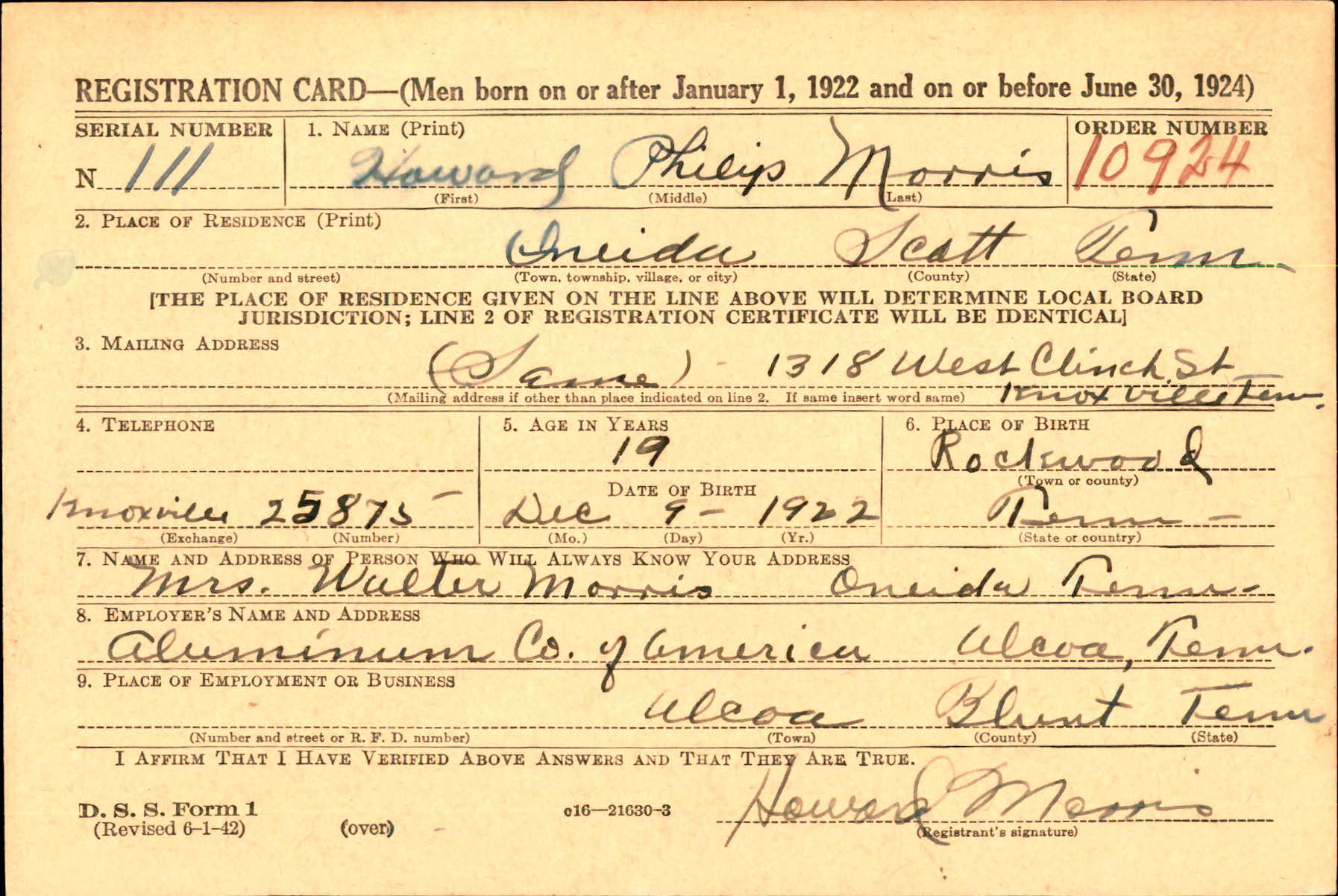 Howard Philip Morris was born 9 December 1922, Rockwood, Roane County, Tennessee. He was the son of Walter Thomas Morris and Malinda A. Mays.