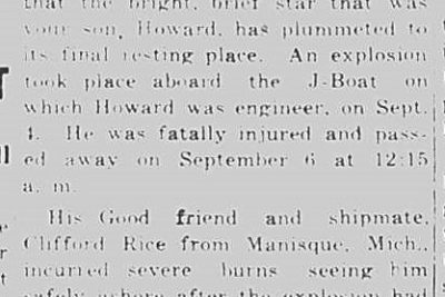 It is my sad duty to inform you that the bright brief star that was your son, Howard, has plummeted to it’s final resting place. An explosion took place aboard the J-Boat on which Howard was engineer, on Sept. 4. He was fatally injured and passed away on September 6 at 12:15 a.m. His Good friend and shipmate Clifford Rice from Manisque, Mich. Incurred severe burns seeing him safely ashore after the explosion had rendered Howard unconsious. Howard was given six blood transfusions and had a nurse with him 24 hours a day, however all the skill that the army medical service could muster did not siffice to see him through safely, Howard was buried in the Allied cemetery, Labanon Island, Borneo. His fellow soldiers acted as pall bearers and Chaplain Whitley of the Australian 9th Division performed the final rites. I was privileged to know Howard well and was proud to count him as my friend. His happy personality and ready wit endeared him to all. He was a splended soldier and upheld the finest traditions of the service. The entire company sympathizes with you on your great loss. I am well aware that there is little that I can say that will assuage your grief. This war has left its mark on nearly every home in the land. Your grief is our grief. Your loss is our loss. A debt of gratitude is owed to those who, like Howard, risked and died in the service of his country. It is a debt that cannot ever be repaid but it is the duty of all of us remaining to see that their sacrifice is not in vain. Offering you my heartfelt sympathy, I am.