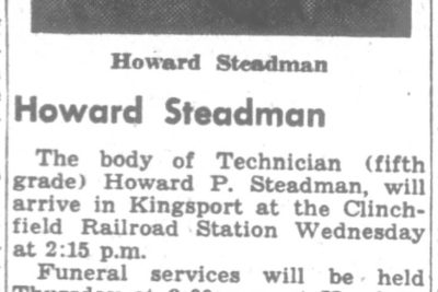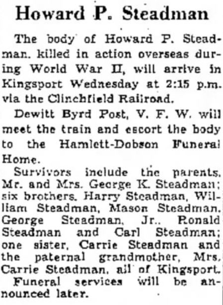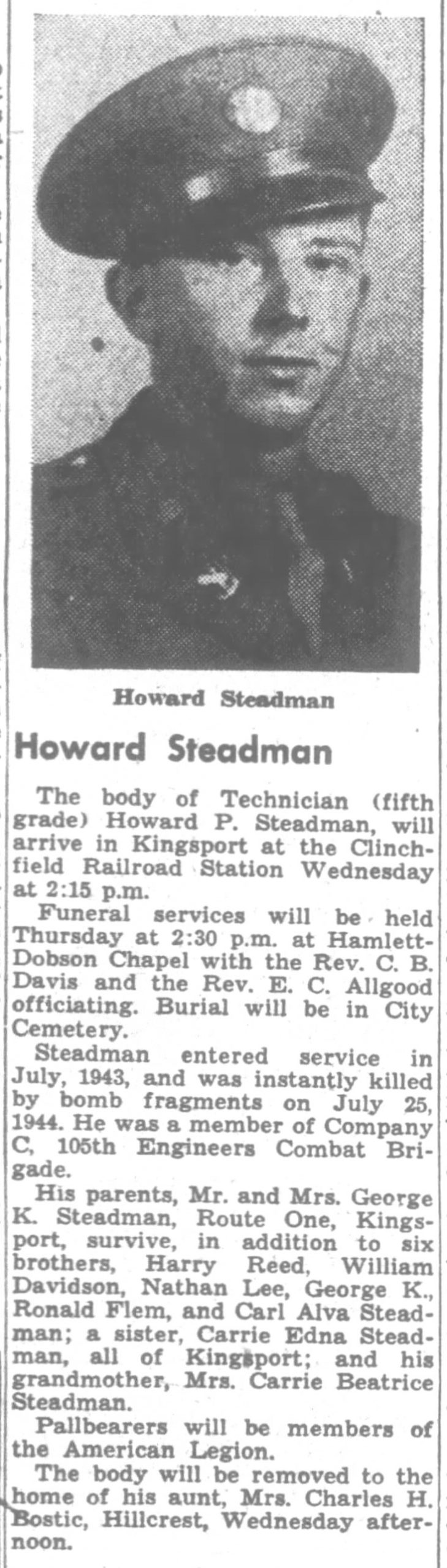 Son of Mr. and Mrs. G.K. Steadman, Route 1, Kingsport, he had been in service since October 1942, and had been overseas seven months.