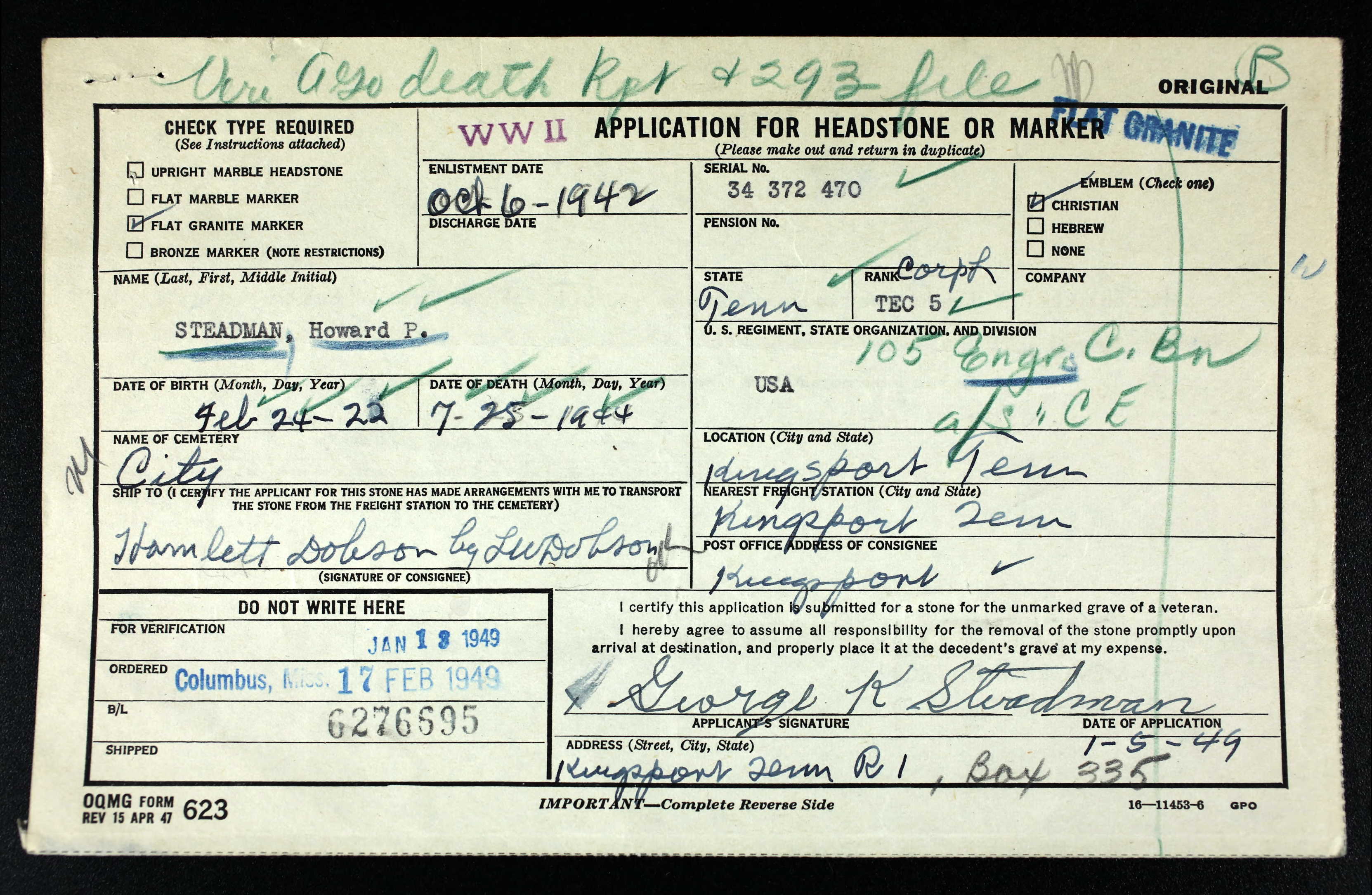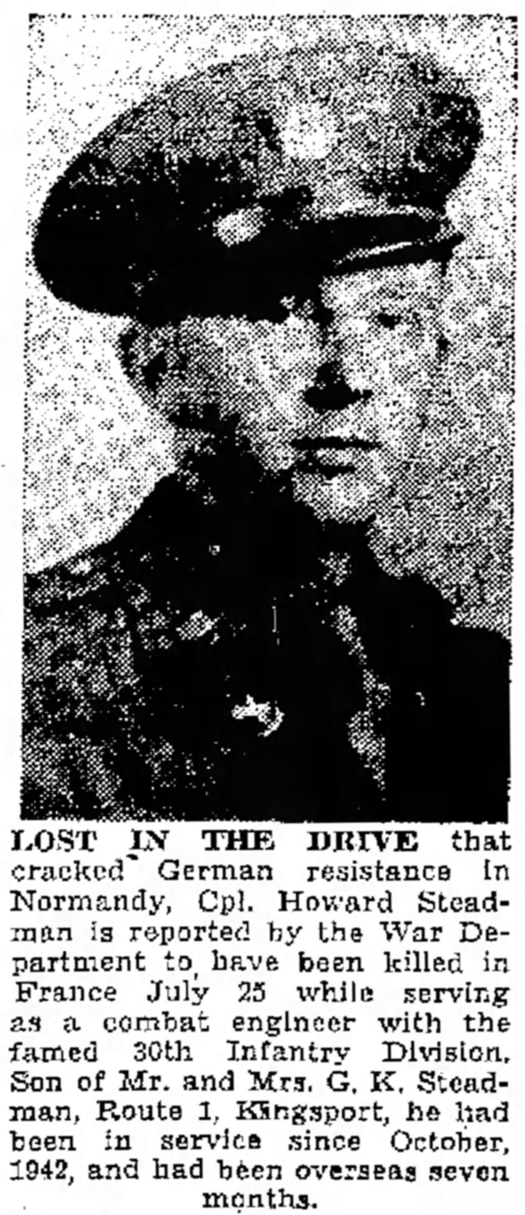 Lost in the drive that cracked German resistance in Normandy, Cpl Howard Steadman is reported by the War Department to have been killed in France July 25 while serving as a combat engineer with the famed 30th Infantry Division.