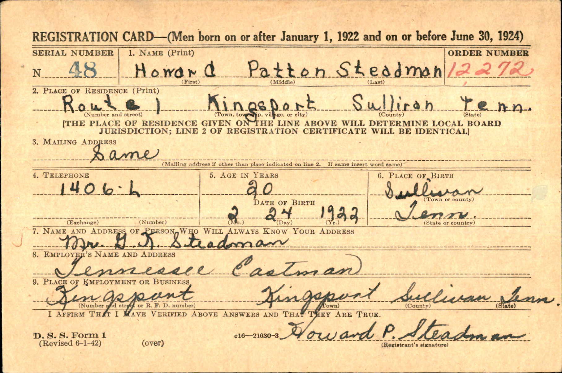 Howard Patton Steadman was born on 24 February 1922, the son of George Kirk Steadman and Cordia Myrtle Barger. He married Helen Meade in Scott, Virginia on 29 December 1943.