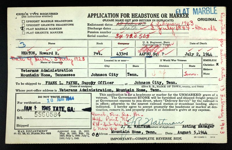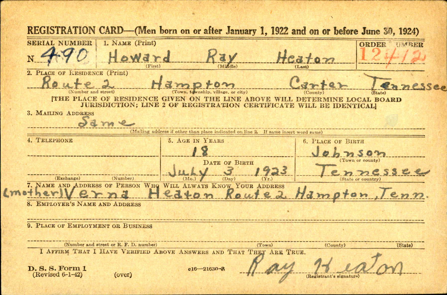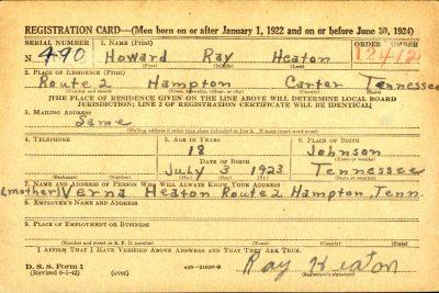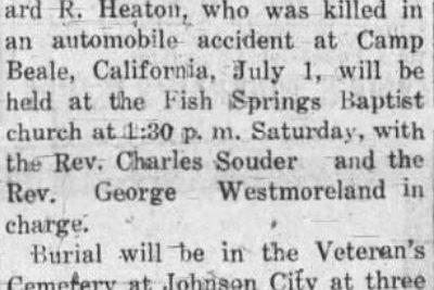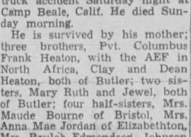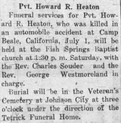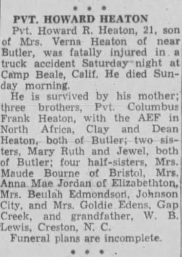 Pvt. Howard R. Heaton, 21, son of Mrs. Verna Heaton of near Butler, was fatally injured in a truck accident Saturday night at Camp Beale, Calif. He died Sunday morning. He is survived by his mother; three brothers, Pvt. Columbus Frank Heaton, with the AEF in North Africa, Clay and Dean Heaton, both of Butler; two sisters, Mary Ruth and Jewel, both of Butler; four half-sisters, Mrs. Maude Bourne of Bristol, Mrs. Anna Mae Jordan of Elizabethton, Mrs. Beulah Edmondson, Johnson City and Mrs. Goldie Edens, Gap Creek, and grandfather, W.B. Lewis, Creston, N.C.