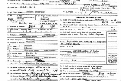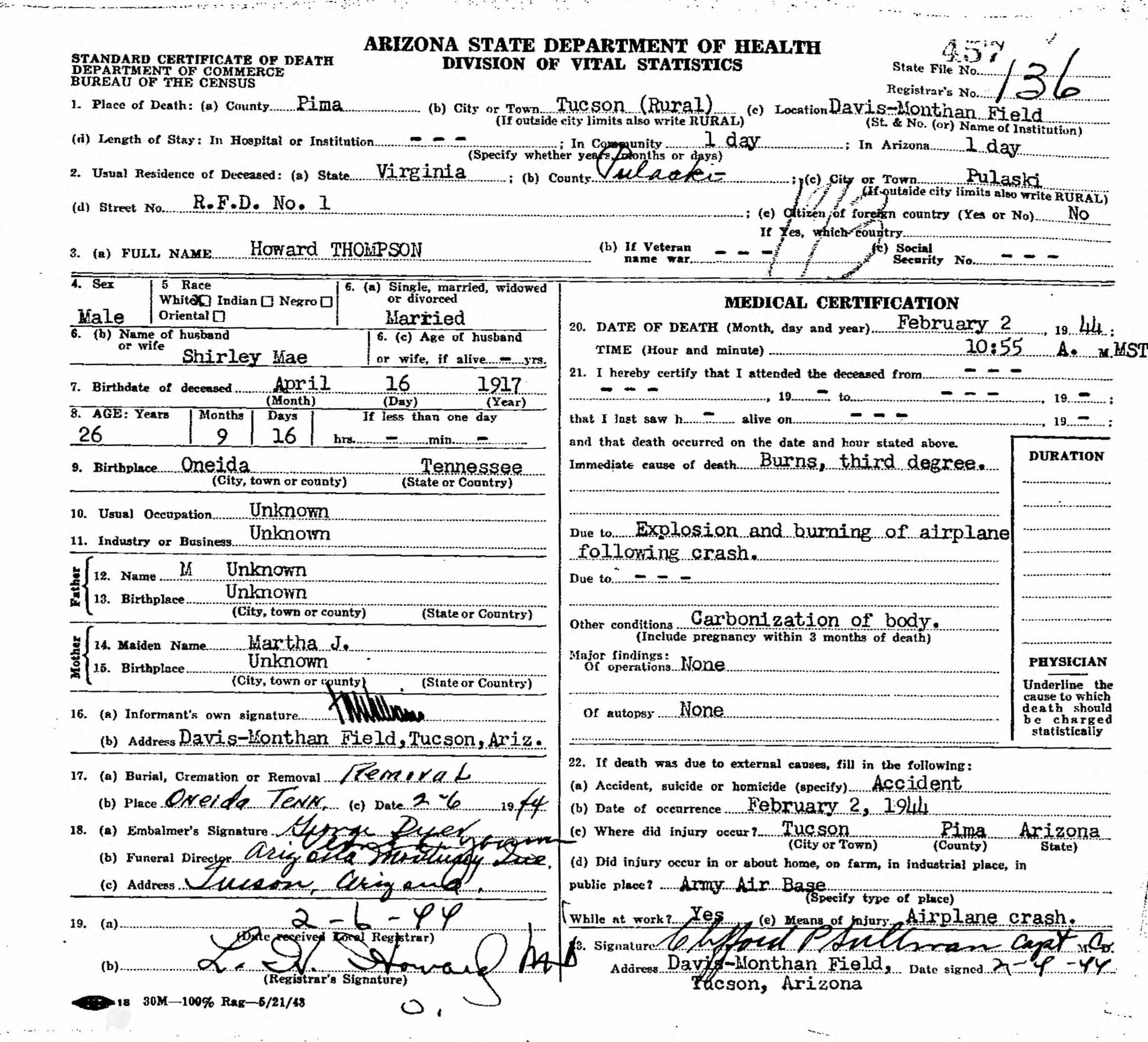 Two men out of a crew of ten were killed yesterday morning in the crash of a B-24 Liberator bomber less than two miles north of the David-Monthan field. Eight of the crew escaped injury as the plane struck the ground and burst into flames. The plane, based at Mitchell field, N.Y., had just taken off from a flying field at Consolidated-Vultee aircraft modification center here and had been in the air only a few minutes when the accident occurred. The dead as identified by Army authorities are: Staff Sgt Thomas Irving, son of Mr. and Mrs. Richard C. Irving, 7 Catherine street, Plains, Pa., and Sgt Howard Thompson, 26, husband of Mrs. Shirley Mae Thompson, Pulaski, Va.