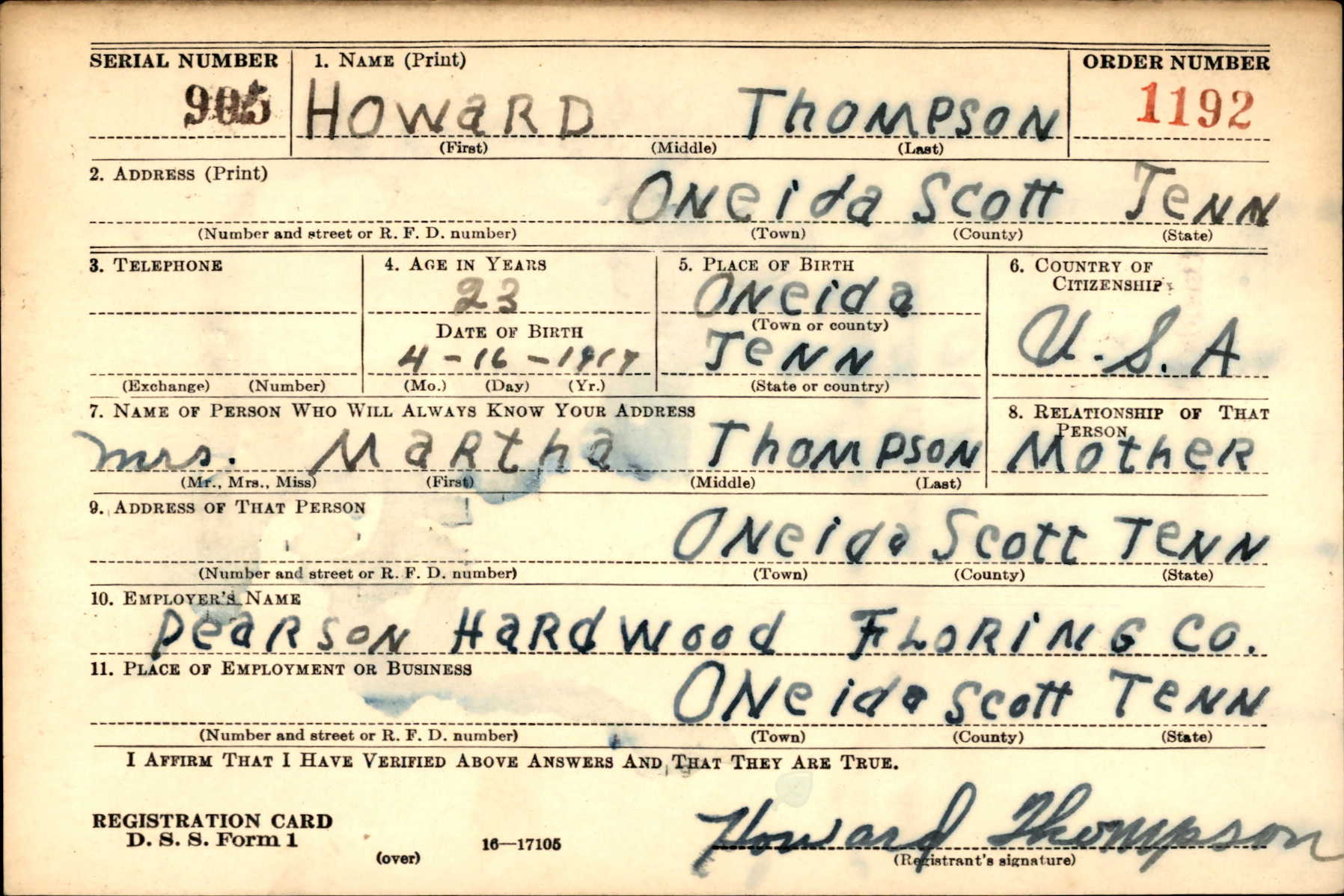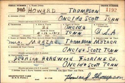 Howard Thompson was born 16 April 191 in Oneida, Scott County, Tennessee, the son of Martha Jane Thompson. He was married to Shirley Mae Thompson and father of Bobby Wayne Thompson.
