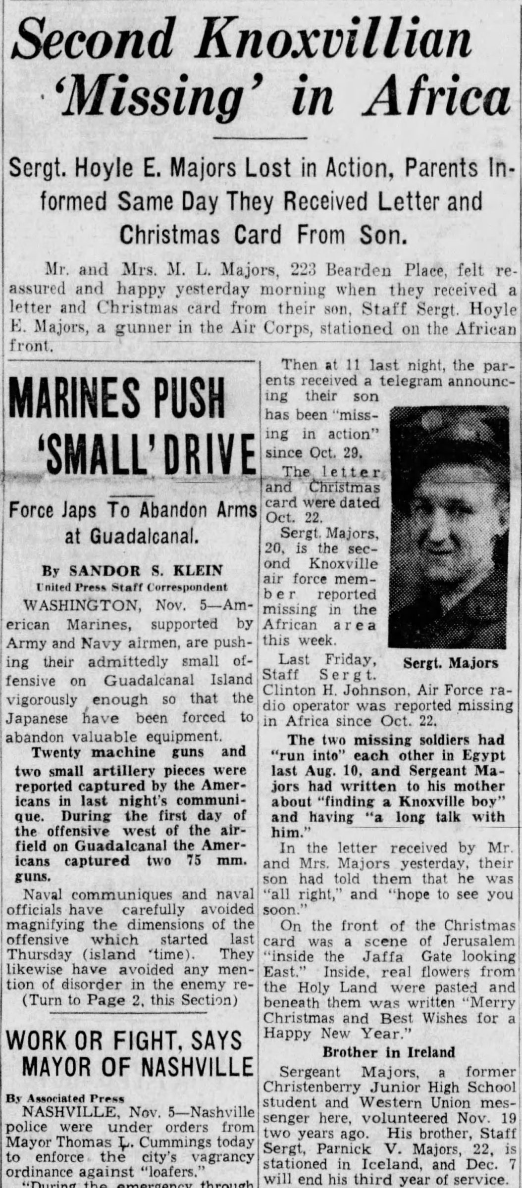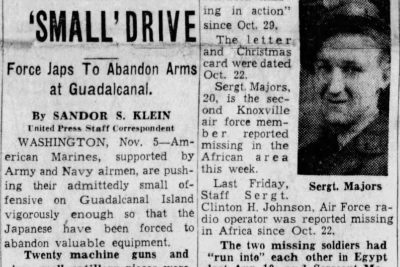 Sergt. Majors, 20, is the second Knoxville air force member reported missing in the African area this week. Last Friday Staff Sergt. Clinton H. Johnson, Air Force radio operator was reported missing in Africa since Oct. 22. The two missing soldiers had “run into” each other in Egypt last Aug. 10, and Sergeant Majors had written to his mother about “finding a Knoxville boy” and having “a long talk with him.” In the letter received by Mr. and Mrs. Majors yesterday, their son had told them that he was “all right” and “hope to see you soon.”