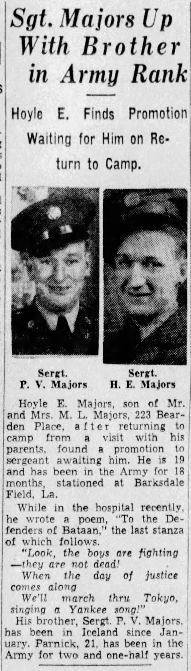 Hoyle E. Majors, son of Mr. and Mrs. M.L. Majors, 223 Bearden Place, after returning to camp from a visit with his parents, found a promotion to sergeant awaiting him. He is 19 and has been in the Army for 18 months, stationed at Barksdale Field, La. While in the hospital recently, he wrote a poem, “To the Defenders of Bataan,” the last stanza of which follows.