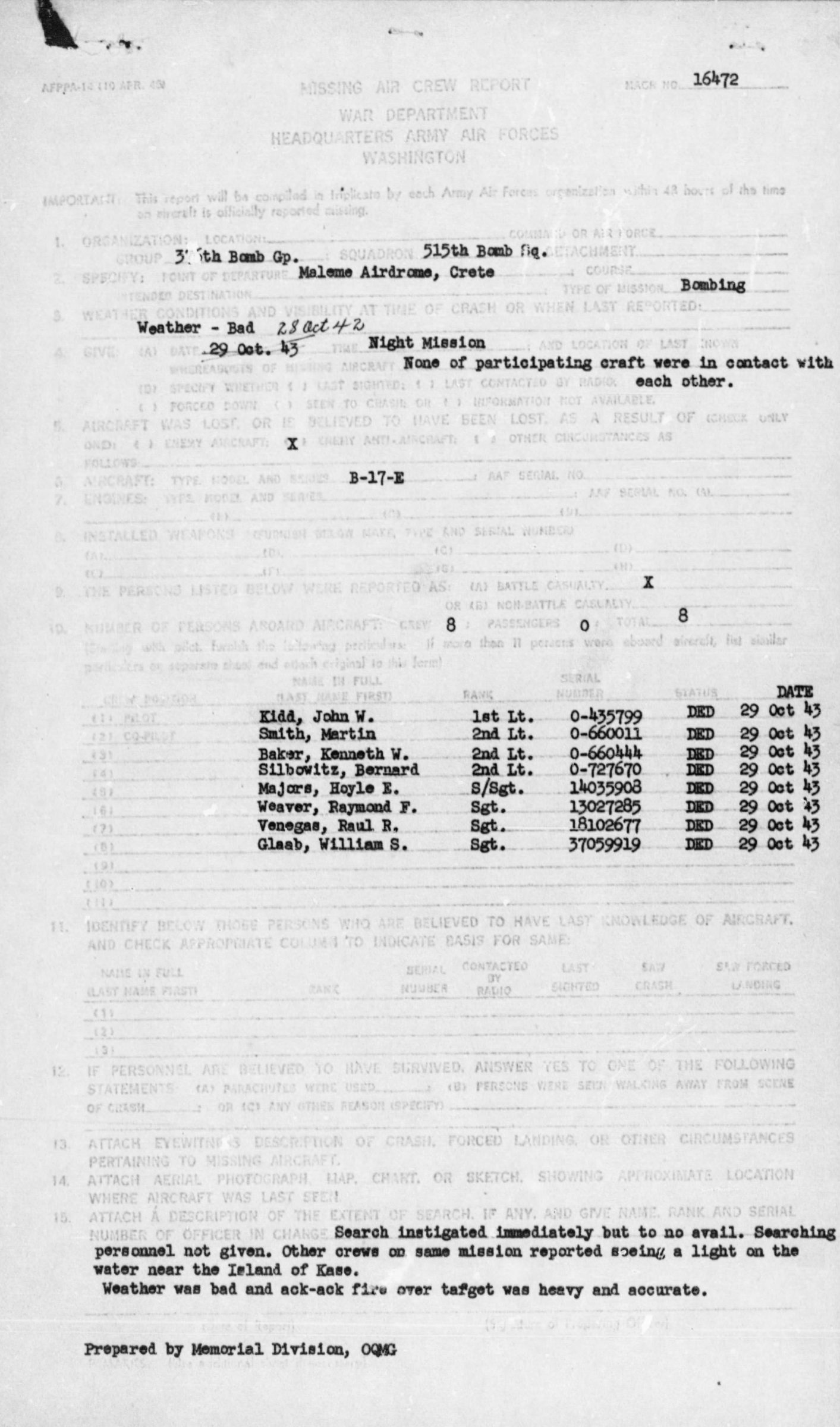 Aircraft B-17E departed from Maleme Airdrome at Crete on a bombing mission. 1st Lt John W. Kidd and his entire crew failed to return from a bombing mission in the Middle East Theatre on October 28, 1942. This mission was at night and of the several airplanes participating were in contact with each other. This fact eliminated the possibility of other airplanes observing the nature of the disappearing of this aircraft. The weather was bad in places and the ack-ack fire over the target was heavy and accurate. Other crews on the same mission reported seeing a light on the water near the island of Kase, off the north-east end of Crete. Rescue search in this area the next day showed no signs either of the plane or crew.