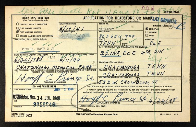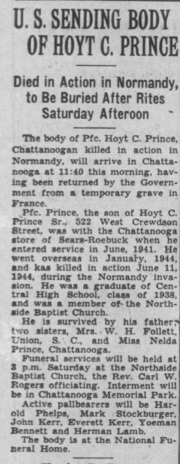 Pfc. Prince, the son of Hoyt C. Prince Sr., 522 West Crewdson Street, was with the Chattanooga store of Sears-Roebuck when he entered service in June, 1941. He went overseas in January, 1944, and was killed in action June 11, 1944, during the Normandy invasion. He was a graduate of Central High School, class of 1938 and was a member of the Northside Baptist Church.